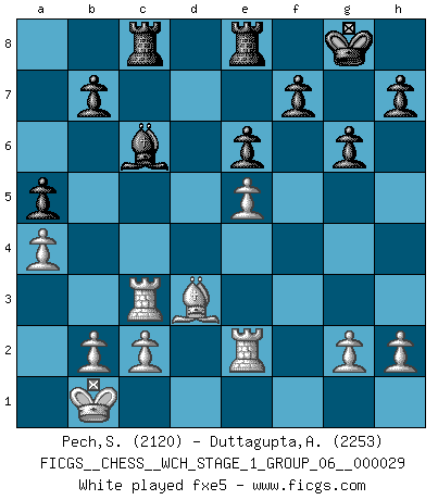 Last move : 0-1 2025 June 18 10:55:7 [Event "FICGS__CHESS__WCH_STAGE_1_GROUP_06__000029"] [Site "FICGS"] [Date "2025.02.02"] [Round "1"] [White "Pech,Stepan"] [Black "Duttagupta,Aniruddha"] [Result "0-1"] [WhiteElo "2120"] [BlackElo "2253"] 1.e4 c5 2.Nf3 d6 3.d4 cxd4 4.Nxd4 Nf6 5.Nc3 Nc6 6.Bc4 Bd7 7.Be3 e6 8.Bb3 Nxd4 9.Qxd4 Be7 10.O-O-O O-O 11.f4 Bc6 12.Kb1 Ng4 13.Rhe1 a5 14.Qc4 Nxe3 15.Rxe3 Qb6 16.Re2 Bf6 17.a4 Rad8 18.Qd3 Bxc3 19.Qxc3 Qc5 20.Rd3 Qxc3 21.Rxc3 g6 22.Bc4 Rc8 23.Bd3 Rfe8 24.e5 dxe5 25.fxe5 Kg7 26.b3 Bd5 27.Rxc8 Rxc8 0-1 This chess game has been lost on time (started : 2025.02.02 2:54:18) Follow this game move after move (download)The isolated Pawn casts gloom over the entire chessboard. (Aaron Nimzovich) Ich kämpfe solange mein Gegner einen Fehler machen kann. (Emanuel Lasker) Puntos débiles o agujeros en la posición de tu oponente deben de ser ocupados por piezas, no Peones. (Siegbert Tarrasch) Si le désir cupide (et stupide) de gagner est une inépuisable source de souffrance, une combinaison brillante sur l'échiquier est une découverte : le coquelicot qui s'épanouit lorsque apparaît la Voie Lactée. (Arrabal) Always be a first-rate version of yourself, instead of a second-rate version of somebody else. (Judy Garland)