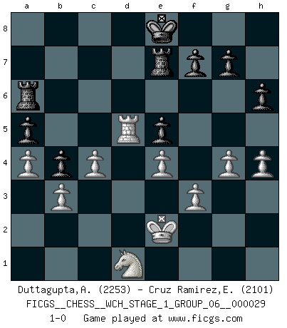 Last move : 1-0 2025 May 16 15:17:26 [Event "FICGS__CHESS__WCH_STAGE_1_GROUP_06__000029"] [Site "FICGS"] [Date "2025.02.02"] [Round "1"] [White "Duttagupta,Aniruddha"] [Black "Cruz Ramirez,Eliecer"] [Result "1-0"] [WhiteElo "2253"] [BlackElo "2101"] 1.e4 e5 2.Nf3 Nc6 3.Bb5 a6 4.Ba4 Nf6 5.O-O Be7 6.Re1 b5 7.Bb3 O-O 8.a4 b4 9.d4 d6 10.dxe5 Nxe5 11.Nxe5 dxe5 12.Qe2 a5 13.Rd1 Ba6 14.Qf3 Qc8 15.Bg5 c5 16.Bxf6 Bxf6 17.Bd5 Rb8 18.c4 Qc7 19.Nd2 Rb6 20.Nb3 Be7 21.Nc1 Bc8 22.Nd3 Rg6 23.Re1 Bg4 24.Qe3 h6 25.Kh1 Bd6 26.f3 Bc8 27.g3 Kh7 28.Rf1 Qd7 29.Qf2 Qe7 30.Rae1 Bh3 31.Rg1 Bc8 32.b3 Bc7 33.Qxc5 Qxc5 34.Nxc5 Rf6 35.Kg2 Bb6 36.Nd3 Bxg1 37.Rxg1 Re8 38.Rc1 Bd7 39.h4 Bc6 40.Kf2 Kg8 41.Ke3 Rd6 42.Nb2 Rc8 43.Rd1 Kf8 44.Nd3 Re8 45.Bxc6 Rxc6 46.Nf2 Rg6 47.g4 Ra6 48.Rd5 Re7 49.Ke2 Ke8 50.Nd1 1-0 Follow this game move after move (download)Blessed be the memory of him who gave the world this immortal game. (A. G. Gardiner) Ich habe kein Problem mit Frauen, sondern nur mit dem Niveau ihres Schachspiels (Judith Polgar) El Ajedrez es de 30 a 40 por ciento psicología. Uno no cuenta con esto cuando se juega contra una computadora. No lo puedo confundir. (Judith Polgar) Shah mat. Le roi est mort. Cri de fierté d'un joueur venant de terrasser son adversaire, courtoisement, sans effusion de sang. I feel so... helpless. (C-3PO in Star Wars ep.3)