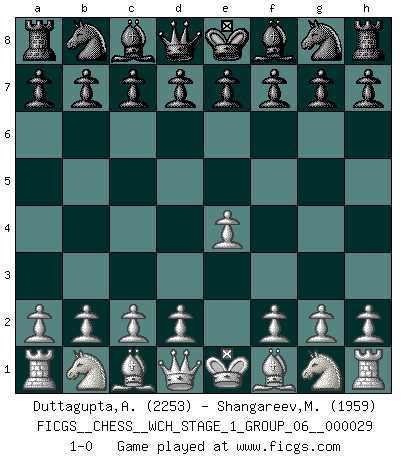 Last move : 1-0 2025 March 4 23:56:48 [Event "FICGS__CHESS__WCH_STAGE_1_GROUP_06__000029"] [Site "FICGS"] [Date "2025.02.02"] [Round "1"] [White "Duttagupta,Aniruddha"] [Black "Shangareev,Mirzian"] [Result "1-0"] [WhiteElo "2253"] [BlackElo "1959"] 1.e4 1-0 This chess game has been lost on time (started : 2025.02.02 2:54:18) Follow this game move after move (download)A passed Pawn increases in strength as the number of pieces on the board diminishes. (Capablanca) Jeder Schachmeister war einmal ein Anfänger. (Irving Chernev) Una buena memoria, concentración, imaginación y una fuerte voluntad, se requiere para llegar a ser un buen jugador. (Bobby Fischer) L'action d'une oeuvre littéraire se déroule sur un champ de bataille. Les masques et les types du drame moderne correspondent aux pièces du jeu d'échecs. L'intrigue correspond aux coups et aux gambits, c'est à dire aux techniques du jeu telles qu'utilisées et interprétées par les joueurs. Les tactiques et les péripéties [mouvements] correspondent aux coups exécutés par l'adversaire. (Viktor Shklovsky) Somewhere in the world there is an epigram for every dilemma. (Hendrik Willem van Loon)
