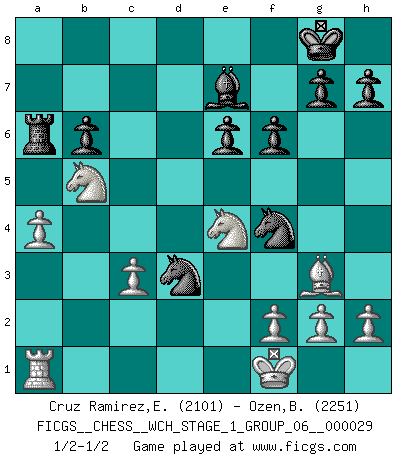 Last move : 1/2-1/2 2025 March 19 4:37:0 [Event "FICGS__CHESS__WCH_STAGE_1_GROUP_06__000029"] [Site "FICGS"] [Date "2025.02.02"] [Round "1"] [White "Cruz Ramirez,Eliecer"] [Black "Ozen,Bahadir"] [Result "1/2-1/2"] [WhiteElo "2101"] [BlackElo "2251"] 1.e4 c5 2.c3 Nf6 3.e5 Nd5 4.Nf3 Nc6 5.Bc4 Nb6 6.Bb3 d5 7.exd6 Qxd6 8.O-O Be6 9.Bxe6 Qxe6 10.a4 Qd7 11.a5 Nd5 12.d4 cxd4 13.Nxd4 e6 14.a6 b6 15.Nb5 Bc5 16.Qa4 O-O 17.Rd1 Qc8 18.Nd2 Rd8 19.Ne4 Ne5 20.Bg5 f6 21.Bh4 Qc6 22.b3 Nf4 23.Rxd8+ Rxd8 24.Nxa7 Qxa4 25.bxa4 Ra8 26.Nb5 Rxa6 27.Kf1 Be7 28.Bg3 Ned3 1/2-1/2 Follow this game move after move (download)Blessed be the memory of him who gave the world this immortal game. (A. G. Gardiner) Es ist nicht das erste mal, dass sich die FIDE dem Arabischen Geld gebeugt hat (über die FIDE WM 2004 in Lybien). (Larry Evans) Las ideas audaces son como las piezas del Ajedrez que avanzan hacia adelante. Ellas pueden ser vencidas, pero también pueden iniciar una partida victoriosa. (Goethe) Les ravages du H expliquent la différence de niveau entre Tal et Thal [Abergel]. A woman without a man is like a fish without a bicycle. (Gloria Steinem)
