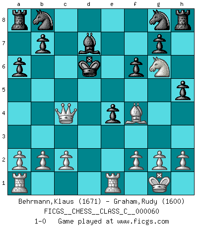 Last move : 1-0 2007 November 16 14:24:39 [Event "FICGS__CHESS__CLASS_C__000060"] [Site "FICGS"] [Date "2007.09.27"] [Round "1"] [White "Behrmann,Klaus"] [Black "Graham,Rudy"] [Result "1-0"] [WhiteElo "1671"] [BlackElo "1600"] 1.e4 e5 2.Nf3 d5 3.exd5 Qxd5 4.Nc3 Qe6 5.Bb5+ c6 6.Be2 f6 7.O-O h5 8.d4 e4 9.d5 cxd5 10.Nxd5 Bd6 11.Re1 Kd8 12.Nf4 Qd7 13.Nd4 Qf7 14.Nb5 a6 15.Qxd6+ Bd7 16.Qc7+ Ke8 17.Nd6+ Ke7 18.Bc4 Qxc4 19.Ng6+ Ke6 20.Qxc4+ Kxd6 21.Bf4+ 1-0 QP counter-gambit (elephant gambit) Kingside Castling by player White (move 7) Player White won this chess game. Follow this game move after move (download)Human affairs are like a Chess game: only those who do not take it seriously can be called good players. (Hung Tzu Ch'eng) Matt entspricht nicht immer den Tatsachen. (Savielly Grigorievitsch Tartakower) Cada Peón es potencialmente una Reina. (James Mason) Tout change constamment, y compris dans le monde des Echecs. (Botvinnik) The ultimate in disposing one's troops is to be without ascertainable shape. Then the most penetrating spies cannot pry in nor can the wise lay plans against you. (Sun Tzu)