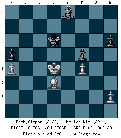 Last move : 0-1 2025 June 13 15:10:29 [Event "FICGS__CHESS__WCH_STAGE_1_GROUP_06__000029"] [Site "FICGS"] [Date "2025.02.02"] [Round "1"] [White "Pech,Stepan"] [Black "Walton,Kim"] [Result "0-1"] [WhiteElo "2120"] [BlackElo "2214"] 1.d4 Nf6 2.c4 d6 3.Nf3 g6 4.Nc3 Bg7 5.e4 O-O 6.Be2 e5 7.dxe5 dxe5 8.Qxd8 Rxd8 9.Bg5 c6 10.Nxe5 Re8 11.O-O-O Na6 12.Rd6 Be6 13.f4 h6 14.Bxf6 Bxf6 15.Rhd1 Kg7 16.Nf3 Bxc3 17.bxc3 Nc5 18.Nd2 g5 19.Rf1 Rad8 20.Rd4 f6 21.Kc2 Bf7 22.g3 Rxd4 23.cxd4 Nxe4 24.Bd3 Nd6 25.a4 b6 26.c5 bxc5 27.dxc5 Nb7 28.Ne4 gxf4 29.gxf4 f5 30.Rg1+ Kf8 31.Nd6 Nxd6 32.cxd6 Rd8 33.Kc3 Rxd6 34.Re1 a5 35.Re5 Rd5 36.Rxd5 cxd5 37.Kd4 Ke7 38.Ke5 d4 39.Kxd4 Kd6 40.Bc4 Be8 41.Bb5 Bf7 42.Bd3 Be8 0-1 Follow this game move after move (download)Checkers is for tramps. (Paul Morphy) Weshalb minderdergeübte Spieler mit g2-g4 beginnen? Die betreffenden sind unschlüssig, ob sie nun rechts (h4) oder links (f4) beginnen sollen, und in ihrer Ratlosigkeit entschliessen sie sich nach guter Bürgerart dazu, den goldenen Mittelweg zu wählen. (Aaron Nimzowitsch) Tu cuerpo tiene que estar en óptima condición. Tu Ajedrez se deteriora como lo hace tu cuerpo. No puedes separar la mente y el cuerpo. (Bobby Fischer) Un footballeur joue avec ses pieds, parfois avec sa tête. Un joueur d'échecs ne joue qu'avec sa tête. Et quand il ne joue plus, il meurt. (Jacob Murray) There is no instance of a country having benefited from prolonged warfare. (Sun Tzu)