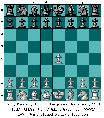 Last move : 1-0 2025 March 6 2:29:26 [Event "FICGS__CHESS__WCH_STAGE_1_GROUP_06__000029"] [Site "FICGS"] [Date "2025.02.02"] [Round "1"] [White "Pech,Stepan"] [Black "Shangareev,Mirzian"] [Result "1-0"] [WhiteElo "2120"] [BlackElo "1959"] 1.e4 1-0 This chess game has been lost on time (started : 2025.02.02 2:54:18) Follow this game move after move (download)Chess is a fairy tale of 1001 blunders. (Savielly Tartakower) Im Schach nämlich geht es darum, daß Ich des Gegners klein zu kriegen, sein Ego zu zerbrechen und zu zermahlen, seine Selbstachtung zu zertreten und zu verscharren und seine ganze mißachtenswerte sogenannte Persönlichkeit ein für alle Mal tot zu hacken und zu zerstampfen und dadurch die menschliche Gesellschaft von einer stinkenden Pestbeule zu befreien. Es ist ein königliches Spiel. (Robert James Fischer) El Ajedrez es tan interesante por sí solo, que no es necesario un interés monetario para persuadir a una persona a que lo practique; por lo tanto, nunca se juega por dinero. (Benjamin Franklin) La conception d'un plan est le processus par lequel un joueur exploite les avantages de sa position tout en s'efforçant d'en réduire au minimum les inconvénients. Afin de garantir le succès, un plan doit toujours se fonder sur un diagnostic objectif des particularités d'une position. La conception d'un plan est d'autant plus difficile que la position est équilibrée, et grandement facilitée lorsqu'il n'existe qu'un seul plan susceptible de répondre aux exigences de la position. (Harry Golombek) Hardware: the parts of a computer that can be kicked. (Jeff Persis)