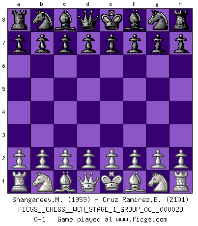 Last move : 0-1 2025 March 4 10:17:48 [Event "FICGS__CHESS__WCH_STAGE_1_GROUP_06__000029"] [Site "FICGS"] [Date "2025.02.02"] [Round "1"] [White "Shangareev,Mirzian"] [Black "Cruz Ramirez,Eliecer"] [Result "0-1"] [WhiteElo "1959"] [BlackElo "2101"] 0-1 This chess game has been lost on time (started : 2025.02.02 2:54:18) Follow this game move after move (download)When I have White, I win because I am white; When I have Black, I win because I am Bogolyubov. (Bogolyubov) Jede Eröffnung ist gut genug um gespielt zu werden, wenn nur ihr Ruf schlecht genug ist. (Savielly Grigorievitsch Tartakower) En el Ajedrez, cuando menos, el valiente hereda la tierra. (Edmar Mednis) Un journaliste : 'Vous préférez avoir une dame de plus sur l'échiquier ou au lit ?' Boris Spassky : 'Ca dépend de la position.' The age of a woman doesn't mean a thing. The best tunes are played on the oldest fiddles. (Ralph Waldo Emerson)
