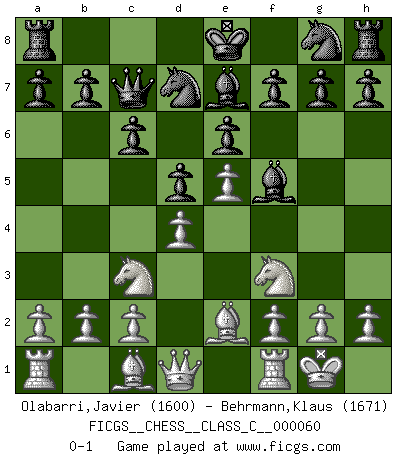 Last move : 0-1 2007 November 13 19:11:39 [Event "FICGS__CHESS__CLASS_C__000060"] [Site "FICGS"] [Date "2007.09.27"] [Round "1"] [White "Olabarri,Javier"] [Black "Behrmann,Klaus"] [Result "0-1"] [WhiteElo "1600"] [BlackElo "1671"] 1.e4 c6 2.Nc3 d5 3.e5 Bf5 4.d4 e6 5.Nf3 Nd7 6.Be2 Be7 7.O-O Qc7 0-1 This chess game has been lost on time (started : 2007.09.27 16:59:43) Caro-Kann defense Kingside Castling by player White (move 7) Player Black won this chess game. Follow this game move after move (download)It's just you and your opponent at the board and you're trying to prove something. (Bobby Fischer) Ich war schon mal beim Dopingtest. Da musste ich Urin abgeben, während Dritte zusahen. (Elisabeth Pähtz) El Ajedrez es una guerra en un tablero. El objetivo es aplastar la mente del oponente. (Bobby Fischer) Le moment que je préfère le plus dans une rencontre, c'est celui où je sens que la personnalité de l'adversaire se brise. (Robert Fischer) It's not the size of the dog in the fight, it's the size of the fight in the dog. (Mark Twain)