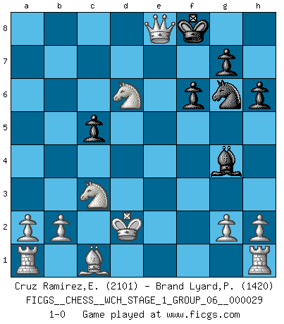 Last move : 1-0 2025 March 14 16:54:9 [Event "FICGS__CHESS__WCH_STAGE_1_GROUP_06__000029"] [Site "FICGS"] [Date "2025.02.02"] [Round "1"] [White "Cruz Ramirez,Eliecer"] [Black "Brand Lyard,Paul"] [Result "1-0"] [WhiteElo "2101"] [BlackElo "1420"] 1.e4 e5 2.Nf3 Nc6 3.Bc4 Bc5 4.c3 Qf6 5.d4 exd4 6.e5 Nxe5 7.Qe2 dxc3 8.Nxe5 Bxf2+ 9.Kd1 Qd6+ 10.Nd3 Kd8 11.Nxc3 Qd4 12.Qxf2 Qg4+ 13.Kc2 f6 14.Ne5 Qh5 15.Nf7+ Ke8 16.Nxh8 d6 17.Bf7+ Qxf7 18.Nxf7 Kf8 19.Ng5 h6 20.Nf3 Bf5+ 21.Kd2 Re8 22.Qxa7 Bg4 23.Nd4 c5 24.Ndb5 Ne7 25.Qxb7 Ng6 26.Nxd6 Re7 27.Qa8+ Re8 28.Qxe8+ 1-0 Follow this game move after move (download)A chess genius has died; a loss for humanity. (Viktor Kortchnoi, about Bobby Fischer's death) Ich bin der einzige Schachspieler, der sich während der Vorbereitungen zum Turnier verletzt hat. (Woody Allen) El Ajedrez es 99 por ciento táctica. (Teichmann) Toutes les manuvres exécutées sur une colonne ouverte ont pour but ultime l'intrusion définitive sur la septième ou la huitième rangée, en plein cur de la position ennemie. (Aaron Nimzovitch) It is the aim of the modern school, not to treat every position according to one general law, but according to the principle inherent in the position. (Richard Reti)