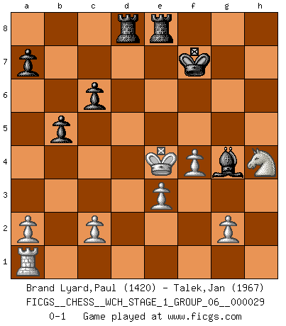 Last move : 0-1 2025 March 3 23:27:7 [Event "FICGS__CHESS__WCH_STAGE_1_GROUP_06__000029"] [Site "FICGS"] [Date "2025.02.02"] [Round "1"] [White "Brand Lyard,Paul"] [Black "Talek,Jan"] [Result "0-1"] [WhiteElo "1420"] [BlackElo "1967"] 1.d4 c6 2.Bf4 Nf6 3.Bxb8 Rxb8 4.e3 d6 5.Bc4 b5 6.Bd3 g6 7.Nf3 Bg7 8.Ng5 O-O 9.h4 e5 10.dxe5 dxe5 11.Nxh7 Nxh7 12.h5 e4 13.hxg6 fxg6 14.Bxe4 Qxd1+ 15.Kxd1 Bxb2 16.Bxg6 Nf6 17.Nd2 Bxa1 18.f4 Bg4+ 19.Nf3 Kg7 20.Kd2 Kxg6 21.Nh4+ Kf7 22.Rxa1 Ne4+ 23.Kd3 Rbd8+ 24.Kxe4 Rfe8+ 0-1 Follow this game move after move (download)During a Chess competition a Chessmaster should be a combination of a beast of prey and a monk. (Alexander Alekhine) Smyslow ist ein Beweis dafür, dass ich noch zehn Jahre spielen kann! [der 75 jährige über den 85 jährigen] (Viktor Kortschnoi) Fischer sacrificó virtualmente todo lo que la mayoría de nosotros los 'debiles' (término que él usa) valoramos, respetamos y apreciamos por el amor de un astuto, a menudo hermoso tablero de juego, por el privilegio ambivalente de ser su mas grande maestro. (Paul Kollar) Les Echecs représentent une sphère d'idées créatrices basée sur la volonté des deux protagonistes. (Smyslov) Hold em is to stud what chess is to checkers. (Johnny Moss)
