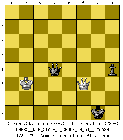 Last move : 1/2-1/2 2025 February 21 23:13:32 [Event "FICGS__CHESS__WCH_STAGE_1_GROUP_SM_01__000029"] [Site "FICGS"] [Date "2025.02.02"] [Round "1"] [White "Gounant,Stanislas"] [Black "Moreira,Jose"] [Result "1/2-1/2"] [WhiteElo "2287"] [BlackElo "2305"] 1.b3 e5 2.Bb2 Nc6 3.e3 Nf6 4.Bb5 Bd6 5.Na3 Na5 6.Be2 a6 7.Nh3 Qe7 8.Nb1 b5 9.O-O O-O 10.f4 Re8 11.c4 bxc4 12.bxc4 Rb8 13.Bxe5 Bxe5 14.fxe5 Qxe5 15.Nc3 d5 16.cxd5 Bxh3 17.gxh3 Nxd5 18.Nxd5 Qg5+ 19.Bg4 Qxd5 20.Rf5 Re5 21.Rxe5 Qxe5 22.Rb1 Rd8 23.Qc2 g6 24.Rc1 c6 25.Bf3 Qg5+ 26.Bg2 Nb7 27.Rf1 Rd6 28.Qe4 Qd8 29.d4 Rd5 30.Qb1 Rb5 31.Qc1 Rb6 32.Bxc6 Nd6 33.e4 Nxe4 34.Bxe4 Qxd4+ 35.Rf2 Qxe4 36.Qc8+ Kg7 37.Rxf7+ Kxf7 38.Qc7+ Qe7 39.Qxb6 Qe1+ 40.Kg2 Qd2+ 41.Qf2+ Qxf2+ 42.Kxf2 a5 43.Ke3 Kf6 44.Kd4 Kg5 45.Kc4 Kh4 46.a4 g5 47.Kb5 Kxh3 48.Kxa5 g4 49.Kb4 Kxh2 50.a5 g3 51.a6 g2 52.a7 g1Q 53.a8Q Qd4+ 54.Kb3 h5 55.Qf3 h4 56.Kc2 Kg1 57.Kb3 Kh2 58.Kc2 Kg1 59.Kb3 1/2-1/2 Follow this game move after move (download)I had a toothache during the first game. In the second game I had a headache. In the third game it was an attack of rheumatism. In the fourth game, I wasn't feeling well. And in the fifth game? Well, must one have to win every game ? (Siegbert Tarrasch) Deine Wertungszahl - vorausgesetzt einige Jahre schachliche Anstrengung - entspricht etwa dem zehnfachen Deines IQ plus 1000. (Jonathan Levitt) ¿Porque tengo que perder ante este idiota?. (Aron Nimzovich) Si le désir cupide (et stupide) de gagner est une inépuisable source de souffrance, une combinaison brillante sur l'échiquier est une découverte : le coquelicot qui s'épanouit lorsque apparaît la Voie Lactée. (Arrabal) Employ the attack like tactic of defense. (Chinese proverb)