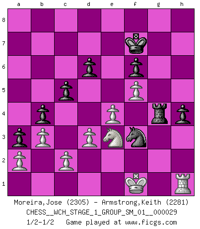 Last move : 1/2-1/2 2025 March 19 13:42:21 [Event "FICGS__CHESS__WCH_STAGE_1_GROUP_SM_01__000029"] [Site "FICGS"] [Date "2025.02.02"] [Round "1"] [White "Moreira,Jose"] [Black "Armstrong,Keith"] [Result "1/2-1/2"] [WhiteElo "2305"] [BlackElo "2281"] 1.e4 e5 2.Nf3 Nc6 3.Bb5 a6 4.Bxc6 dxc6 5.O-O Bg4 6.h3 h5 7.d3 Qf6 8.Nbd2 g5 9.Nc4 Bxf3 10.Qxf3 Qxf3 11.gxf3 f6 12.h4 gxh4 13.f4 b5 14.Na5 exf4 15.Bxf4 Kd7 16.Nb3 Bd6 17.Bxd6 cxd6 18.f3 Ne7 19.Kf2 c5 20.Rh1 Ng6 21.Rag1 Rhg8 22.Nc1 a5 23.Ne2 b4 24.f4 a4 25.f5 Ne5 26.Rxg8 Rxg8 27.Nf4 a3 28.b3 Ng4+ 29.Ke2 Ne5 30.Kf1 Nf3 31.Nxh5 Ke7 32.Nf4 Rg4 33.Nd5+ Kf7 34.Ne3 Rf4 35.Ng2 Rg4 36.Ne3 Rg3 37.Nd5 Rg4 38.Ne3 1/2-1/2 Follow this game move after move (download)Chess is a beautiful mistress. (Bent Larsen) Schachspieler können ausgezeichnet Varianten am Schachbrett berechnen, aber nicht im realen Leben. Zu stark ist der Individualismus im Schach ausgeprägt, und für viele ist ein kleiner momentaner persönlicher Vorteil wichtiger als ein weit größerer Vorteil von morgen. (Anatoly Karpov) Yo nunca en mi vida he jugado la Defensa Francesa, que viene siendo la más aburrida de todas las Aperturas. (Wilhelm Steinitz) Shah mat. Le roi est mort. Cri de fierté d'un joueur venant de terrasser son adversaire, courtoisement, sans effusion de sang. Beep ! (R2D2 in Star Wars ep.3)