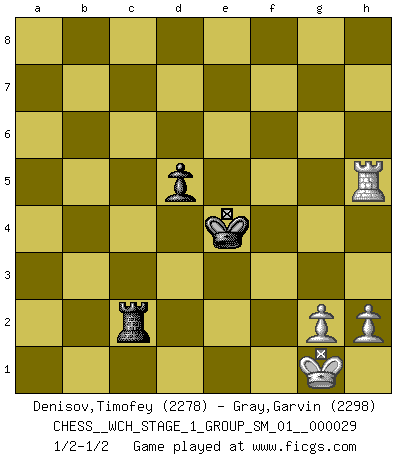 Last move : 1/2-1/2 2025 June 2 8:31:54 [Event "FICGS__CHESS__WCH_STAGE_1_GROUP_SM_01__000029"] [Site "FICGS"] [Date "2025.02.02"] [Round "1"] [White "Denisov,Timofey"] [Black "Gray,Garvin"] [Result "1/2-1/2"] [WhiteElo "2278"] [BlackElo "2298"] 1.e4 e5 2.Nf3 Nf6 3.d4 Nxe4 4.Bd3 d5 5.Nxe5 Nd7 6.Nc3 Nxe5 7.dxe5 Nxc3 8.bxc3 Bc5 9.O-O O-O 10.Qh5 g6 11.Qh6 Re8 12.Bg5 Bf8 13.Bxd8 Bxh6 14.Bxc7 Bf5 15.Rad1 Bxd3 16.Rxd3 Rac8 17.Bd6 Bf8 18.f4 Red8 19.Bxf8 Kxf8 20.f5 Ke7 21.Rh3 Rh8 22.Rb1 b6 23.Rf1 gxf5 24.Rxf5 h5 25.a4 Rc4 26.Rhf3 Rh7 27.a5 bxa5 28.Rf6 a4 29.Ra6 Rh8 30.Rxa7+ Ke6 31.Raxf7 Rxc3 32.Rxc3 Kxf7 33.Rc7+ Ke6 34.Ra7 Rc8 35.Rxa4 Rxc2 36.Rh4 Kxe5 37.Rxh5+ Ke4 1/2-1/2 Follow this game move after move (download)I'm not a materialistic person, in that, I don't suffer the lack or loss of money. The absence of worldly goods I don't look back on. For Chess is a way I can be as materialistic as I want without having to sell my soul. (Jamie Walter Adams) Modernes Schach erfordert enorme Anspannung. Es ist für einen normalen Menschen unmöglich das auszuhalten. (Viktor Kortschnoi) El juego de Damas es para vagabundos. (Paul Morphy) D'abord les bases : Jouez et étudiez, puis étudiez et jouez, ensuite jouez et étudiez, puis étudiez et jouez. Deuxièmement : Donnez toujours le meilleur de vous-même ! (Ken Smith) See no evil, hear no evil, speak no evil. (The 3 monkeys)