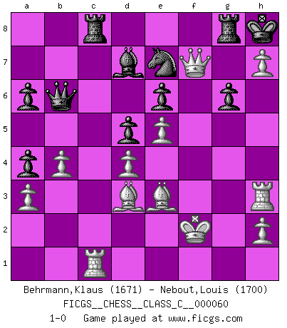 Last move : 1-0 2007 November 26 18:24:16 [Event "FICGS__CHESS__CLASS_C__000060"] [Site "FICGS"] [Date "2007.09.27"] [Round "1"] [White "Behrmann,Klaus"] [Black "Nebout,Louis"] [Result "1-0"] [WhiteElo "1671"] [BlackElo "1700"] 1.e4 e6 2.d4 d5 3.e5 c5 4.c3 Nc6 5.Nf3 Qb6 6.a3 cxd4 7.cxd4 Nge7 8.Nc3 Nf5 9.Na4 Qc7 10.Bf4 Be7 11.Rc1 O-O 12.b4 a6 13.Bd3 b5 14.g4 Nh4 15.Nxh4 Bxh4 16.g5 bxa4 17.Qh5 Bxf2+ 18.Kxf2 g6 19.Qh4 Qb6 20.Be3 Ne7 21.Rhg1 Bd7 22.Rg3 Rac8 23.Rh3 h5 24.gxh6 Kh7 25.Qf6 Rg8 26.Qxf7+ Kh8 27.h7 1-0 French : Advance, Paulsen attack Kingside Castling by player Black (move 11) Player White won this chess game. Follow this game move after move (download)Nonsense was the last thing Fischer was interested in, as far as Chess was concerned. (Elie Agur) Sie führen leise Selbstgespräche, schlürfen lautstark ihre Getränke, schmatzen hörbar beim Essen, blasen ihrem Gegenüber Rauch in die Augen, niesen ihm ins Gesicht, starren ihn unverwandt an, bis er sich unter ihren Blicken windet, rutschen ständig auf ihrem Stuhl hin und her, rülpsen und bohren in der Nase. (Anonymous) El Jaque al descubierto es el bombardero del tablero. (Reuben Fine) Les Echecs sont affaire de jugement sensible. Savoir quand frapper et quand esquiver. (Fischer) . 'gn is not allowed in chess unless n is an integer between 1 and 8 inclusive, where 1 and 8 are to interpreted as the standard numerals standing for integers in the ordered real-closed field R, with the *canonical* ordering. (As opposed to, say, an integer in the domain Z[2+i*sqrt(5)] or an integer in some exotic Grothendieck topos). (Normajean Yates)