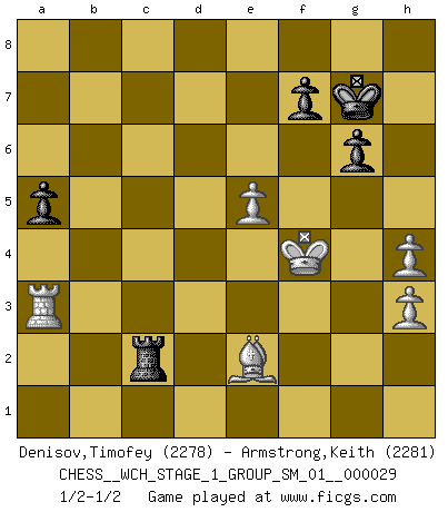 Last move : 1/2-1/2 2025 May 11 9:17:9 [Event "FICGS__CHESS__WCH_STAGE_1_GROUP_SM_01__000029"] [Site "FICGS"] [Date "2025.02.02"] [Round "1"] [White "Denisov,Timofey"] [Black "Armstrong,Keith"] [Result "1/2-1/2"] [WhiteElo "2278"] [BlackElo "2281"] 1.d4 Nf6 2.c4 e6 3.Nf3 d5 4.Nc3 Bb4 5.Bg5 h6 6.Bxf6 Qxf6 7.e3 O-O 8.Be2 dxc4 9.O-O Bxc3 10.bxc3 b6 11.Ne5 Bb7 12.Nxc4 Rd8 13.f4 Nd7 14.Bf3 Bd5 15.Ne5 c5 16.e4 Bb7 17.Nc4 Ba6 18.e5 Qe7 19.Qb3 Bxc4 20.Qxc4 Rac8 21.d5 exd5 22.Qxd5 c4 23.Qb7 Qc5+ 24.Kh1 Rc7 25.Qe4 Qe7 26.Rad1 Nc5 27.Qxc4 Nd3 28.Qe4 Rxc3 29.h3 Nc5 30.Rxd8+ Qxd8 31.Qc6 Qd7 32.Qxd7 Nxd7 33.Rd1 Rc7 34.Bg4 Nc5 35.Rd8+ Kh7 36.g3 g6 37.Kg2 Kg7 38.Rd6 b5 39.Be2 b4 40.Rd4 b3 41.axb3 Nxb3 42.Rb4 Nc5 43.Kf3 h5 44.Ke3 a5 45.Rb8 Ne6 46.Rb3 Rc2 47.Ra3 h4 48.gxh4 Nxf4 49.Kxf4 1/2-1/2 Follow this game move after move (download)Chess is above all, a fight ! (Emanuel Lasker) Ich erzeugte keinen Neid, da mich die Schachspieler als Musiker und die Musiker als Schachspieler betrachteten. (Mark Taimanov) Nunca antes ha habido un jugador de Ajedrez con tal conocimiento a fondo de las complejidades del juego y una inmensa voluntad absolutamente indomable de ganar. Yo pienso que Fischer es el jugador mas grande que jamás haya existido. (Lisa Lane) Les Cavaliers se révèlent fort utiles dans les positions fermées. D'habitude, les Fous sont un peu plus forts que les Cavaliers dans les positions ouvertes. Qu'on le veuille ou non, il restera toujours des exceptions ! Luck never made a man wise. (Seneca, Letters to Lucilius)