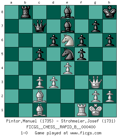 Last move : 1-0 2025 March 12 21:56:40 [Event "FICGS__CHESS__RAPID_B__000400"] [Site "FICGS"] [Date "2025.02.05"] [Round "1"] [White "Pintor,Manuel"] [Black "Strohmeier,Josef"] [Result "1-0"] [WhiteElo "1735"] [BlackElo "1731"] 1.e4 c5 2.f4 Nc6 3.Nf3 d6 4.Bc4 e6 5.O-O a6 6.a4 Be7 7.d3 Qc7 8.Ng5 Nf6 9.Nc3 O-O 10.Qf3 h6 11.Nh3 Bd7 12.Ne2 Rab8 13.c3 b5 14.axb5 axb5 15.Bb3 Ra8 16.Rxa8 Rxa8 17.Ng3 b4 18.Nh5 bxc3 19.bxc3 Rb8 20.Bc2 Nxh5 21.Qxh5 Be8 22.f5 f6 23.Qg4 Ne5 24.Qg3 Kh8 25.Nf4 exf5 26.Ne6 1-0 Follow this game move after move (download)Man is a frivolous, a specious creature, and like a Chess player, cares more for the process of attaining his goal than for the goal itself. (Dostoyevsky) Es ist wirklich schade, dass so viele Schachspieler nicht auf ihr Äußeres achten! (Alexandra Kosteniuk) El Ajedrez es una manera fabulosa para que los niños aprendan a autovalorarse y a autoestimarse. (Saudin Robovic) Je crois qu'il existe des manières très spécifiques de jouer efficacement contre une machine. Evidemment, nous n'avons aucune chance en technique pure, parce que l'ordinateur calcule de manière parfaite. Mais lorsque nous faisons appel à notre cerveau, en utilisant l'intuition et la compréhension, alors nous restons beaucoup plus forts. (Anatoli Karpov) CHESS, n. f. [echecs, Fr.] A nice and abstruse game, in which two sets of puppets are moved in opposition to each other. (Dr Samuel Johnson, A Dictionary Of The English Language, 1755)