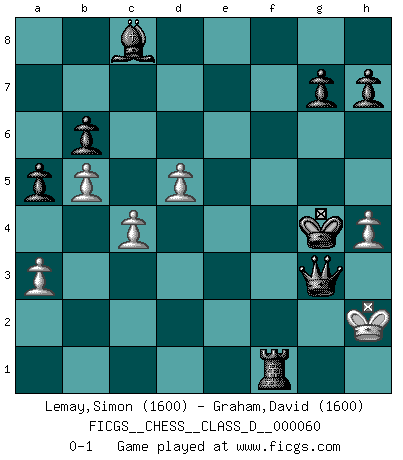 Last move : 0-1 2007 October 7 3:24:52 [Event "FICGS__CHESS__CLASS_D__000060"] [Site "FICGS"] [Date "2007.09.29"] [Round "1"] [White "Lemay,Simon"] [Black "Graham,David"] [Result "0-1"] [WhiteElo "1600"] [BlackElo "1600"] 1.d4 Nf6 2.c4 e6 3.Nf3 b6 4.Nc3 Bb7 5.e3 Bb4 6.Be2 O-O 7.Bd2 d6 8.O-O Nbd7 9.a3 Bxc3 10.Bxc3 Ne4 11.Qc2 f5 12.b4 Nxc3 13.Qxc3 Nf6 14.Nd2 Qe8 15.Rad1 a5 16.b5 Qg6 17.f3 Rae8 18.Rf2 e5 19.d5 Bc8 20.Rdf1 Re7 21.Qc2 Qh6 22.Nb3 Qxe3 23.Bd3 e4 24.fxe4 fxe4 25.Be2 Ref7 26.Qd2 Qxb3 27.Qg5 Qc3 28.h4 Qd4 29.Kh1 e3 30.Rf4 Qd2 31.Bh5 e2 32.Bxf7+ Rxf7 33.Rxf6 exf1Q+ 34.Rxf1 Rxf1+ 35.Kh2 Qe1 36.Qd8+ Kf7 37.Qxc7+ Kg6 38.Qxd6+ Kh5 39.g4+ Kxg4 40.Qg3+ Qxg3+ 0-1 Queen's Indian : 4.Nc3 Kingside Castling by player Black (move 6) Kingside Castling by player White (move 8) Promotion Queen by player Black (move 33) Player Black won this chess game. Follow this game move after move (download)The mistakes are there, waiting to be made. (Savielly Tartakower) Kein Schachspieler kann gut schlafen. (H. G. Wells) El Ajedrez es en su esencia, un juego. En su forma, un arte. Y en su ejecución, una ciencia. (Baron Tassilo) Toutes les manuvres exécutées sur une colonne ouverte ont pour but ultime l'intrusion définitive sur la septième ou la huitième rangée, en plein cur de la position ennemie. (Aaron Nimzovitch) Thibault, I ask for draw. Game 13876. - Sorry Ilmars, you won. (FICGS chat)