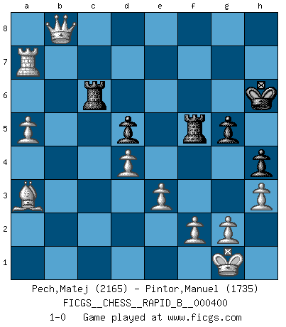Last move : 1-0 2025 May 24 3:2:57 [Event "FICGS__CHESS__RAPID_B__000400"] [Site "FICGS"] [Date "2025.02.05"] [Round "1"] [White "Pech,Matej"] [Black "Pintor,Manuel"] [Result "1-0"] [WhiteElo "2165"] [BlackElo "1735"] 1.b4 e5 2.Bb2 Nc6 3.b5 Nd4 4.e3 Ne6 5.Bxe5 d6 6.Bb2 Nf6 7.Nf3 Nc5 8.c4 Be7 9.d4 Nce4 10.Bd3 O-O 11.Qc2 d5 12.O-O Bf5 13.cxd5 Qxd5 14.Ne5 Qe6 15.Nc3 Nd5 16.Bxe4 Nb4 17.Bxf5 Nxc2 18.Bxe6 fxe6 19.Rac1 Nb4 20.a3 Nd5 21.Nxd5 exd5 22.Rxc7 Bd8 23.Rxb7 Bb6 24.a4 h5 25.Rc1 Kh7 26.Nc6 Kh6 27.a5 Bd8 28.Ba3 Rf5 29.Nxd8 Rxd8 30.Rxa7 Rg8 31.b6 h4 32.h3 g5 33.Rc6+ Rg6 34.b7 Rxc6 35.b8Q 1-0 Follow this game move after move (download)The combination player thinks forward; he starts from the given position, and tries the forceful moves in his mind. (Emanuel Lasker) Mit Schach schule ich mein Gefühl für Geometrie, was für Tennis und Schach gleichermaßen wichtig ist. (Boris Becker) El juego de Damas es para vagabundos. (Paul Morphy) Tous ces prétendus hommes politiques sont les pions, les Cavaliers, les Tours ou les Fous d'une partie d'échecs qui se jouera tant qu'un hasard ne renversera pas l'échiquier. (Honoré de Balzac) Before all elsed, be armed. (Niccolo Machiavelli)