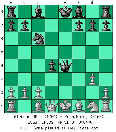 Last move : 0-1 2025 April 8 10:47:6 [Event "FICGS__CHESS__RAPID_B__000400"] [Site "FICGS"] [Date "2025.02.05"] [Round "1"] [White "Alencar,Ofir"] [Black "Pech,Matej"] [Result "0-1"] [WhiteElo "1764"] [BlackElo "2165"] 1.d4 Nf6 2.d5 c6 3.dxc6 Nxc6 4.Nc3 d5 5.e3 e5 6.f3 d4 7.exd4 exd4 8.Ne4 Nxe4 9.fxe4 Qh4+ 10.g3 Qxe4+ 0-1 Follow this game move after move (download)Those who say they understand Chess, understand nothing. (Robert Hubner) Ich bin stolz ein Bulgare zu sein. (Veselin Topalov) El Ajedrez por encima de todo... ¡es una pelea!. (Emanuel Lasker) Aidez vos pièces, elles vous aideront. (Paul Morphy) There are two kinds of people in the world, my friend. Those who have a loaded gun and those who dig. You dig ! (Blondie in The Good, The Bad and The Ugly)