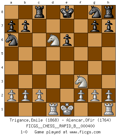 Last move : 1-0 2025 February 14 14:50:55 [Event "FICGS__CHESS__RAPID_B__000400"] [Site "FICGS"] [Date "2025.02.05"] [Round "1"] [White "Trigance,Emile"] [Black "Alencar,Ofir"] [Result "1-0"] [WhiteElo "1868"] [BlackElo "1764"] 1.e4 d5 2.exd5 Qxd5 3.Nc3 Qd8 4.d4 Nc6 5.Bb5 Bd7 6.d5 Nb8 7.Bf4 Bxb5 8.Nxb5 Na6 9.Nf3 e6 10.dxe6 Qxd1+ 11.Rxd1 fxe6 12.Bxc7 Rc8 13.Bd6 Bxd6 14.Nxd6+ 1-0 Follow this game move after move (download)Fischer was a master of clarity and a king of artful positioning. His opponents would see where he was going but were powerless to stop him. (Bruce Pandolfini) Das Schachspiel hat wie die Liebe, die Musik, die Fähigkeit, den Menschen glücklich zu machen. Ich habe ein leises Gefühl des Bedauerns für jeden, der das Schachspiel nicht kennt, so wie ich jeden bedaure, der die Liebe nicht kennt. (Siegbert Tarrasch) ¿Quién es tu oponente esta tarde? Esta tarde mi oponente son las piezas negras. (Akiba Rubinstein) Les Cavaliers se révèlent fort utiles dans les positions fermées. D'habitude, les Fous sont un peu plus forts que les Cavaliers dans les positions ouvertes. Qu'on le veuille ou non, il restera toujours des exceptions ! A good book on your shelf is a friend that turns its back on you and remains a friend. (Author unknown)