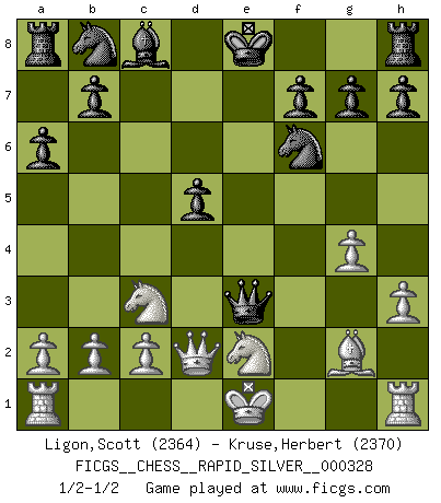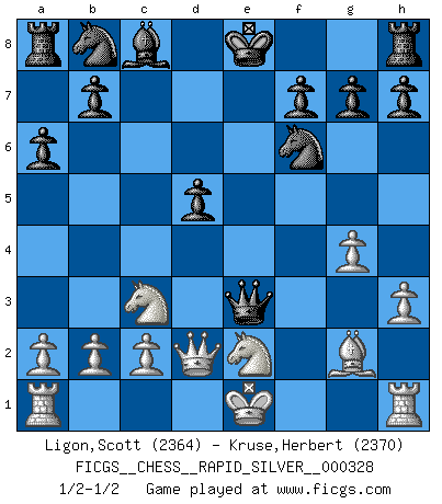 Last move : 1/2-1/2 2025 February 7 18:14:20 [Event "FICGS__CHESS__RAPID_SILVER__000328"] [Site "FICGS"] [Date "2025.02.06"] [Round "2"] [White "Ligon,Scott"] [Black "Kruse,Herbert"] [Result "1/2-1/2"] [WhiteElo "2364"] [BlackElo "2370"] 1.e4 c5 2.Nf3 d6 3.d4 cxd4 4.Nxd4 Nf6 5.Nc3 a6 6.h3 e6 7.g4 d5 8.Nde2 Bc5 9.exd5 Qb6 10.Be3 Bxe3 11.fxe3 Qxe3 12.Bg2 exd5 13.Qd2 1/2-1/2 Follow this game move after move (download)Though most people love to look at the games of the great attacking masters, some of the most successful players in history have been the quiet positional players. They slowly grind you down by taking away your space, tying up your pieces, and leaving you with virtually nothing to do ! (Yasser Seirawan) Frage des Reporters: -Welche besonderen Umstände rechtfertigen das Anhalten der Uhren während einer Turnierpartie? Antwort: -Einen Fotographen zu strangulieren. (Siegbert Tarrasch) La esencia del Ajedrez es pensar acerca de lo que el Ajedrez es. (David Bronstein) Aux échecs, l'amour-propre est satisfait quand on remporte la victoire, mais il n'y a pas de honte à être battu. (Benjamin Franklin) He who fights with monsters should be careful lest he thereby become a monster. (Friedrich Nietzsche, Beyond Good and Evil)