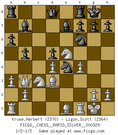 Last move : 1/2-1/2 2025 February 17 15:11:41 [Event "FICGS__CHESS__RAPID_SILVER__000329"] [Site "FICGS"] [Date "2025.02.06"] [Round "1"] [White "Kruse,Herbert"] [Black "Ligon,Scott"] [Result "1/2-1/2"] [WhiteElo "2370"] [BlackElo "2364"] 1.d4 Nf6 2.c4 e6 3.a3 d5 4.e3 b6 5.Nf3 Bb7 6.Nc3 Nbd7 7.cxd5 exd5 8.Ne5 Bd6 9.f4 O-O 10.Bd2 c5 11.Bd3 Ne4 12.O-O cxd4 13.exd4 Ndf6 14.Nb5 Be7 15.Be1 a6 16.Nc3 b5 17.Qb3 1/2-1/2 Follow this game move after move (download)All that matters on the Chessboard is good moves. (Bobby Fischer) Ich tröste mich mit dem Vergnügen, daß Schachfans, Zuschauer und Leser glücklich sind, wenn ein Großmeister etwas riskiert, statt nur Klötzchen zu schieben. (Mikhail Nekhemyevich Tal) Si pudieramos observar el interior de la cabeza de un jugador de Ajedrez, encontraríamos ahí un mundo lleno de sentimientos, imágenes, ideas, emoción y pasión. (Alfred Binet) Horreur, mais aussi harmonie suprême : qu'y avait-il en effet au monde en dehors des échecs ? Le brouillard, l'inconnu, le non-être... (Vladimir Nabokov) They say poker is a zero-sum game. It must be, because every time I play my sum ends up zero. (Max Shapiro)