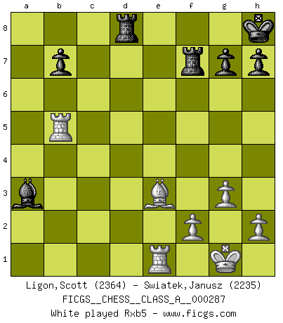 Last move : 1/2-1/2 2025 May 1 22:59:21 [Event "FICGS__CHESS__CLASS_A__000287"] [Site "FICGS"] [Date "2025.02.09"] [Round "1"] [White "Ligon,Scott"] [Black "Swiatek,Janusz"] [Result "1/2-1/2"] [WhiteElo "2364"] [BlackElo "2235"] 1.e4 e5 2.Nf3 Nc6 3.Bb5 Nf6 4.O-O Nxe4 5.Re1 Nd6 6.Nxe5 Be7 7.Bf1 Nxe5 8.Rxe5 O-O 9.d4 Ne8 10.c4 Bf6 11.Re1 d5 12.cxd5 Qxd5 13.Be3 Be6 14.Nc3 Qa5 15.Ne4 Rd8 16.Nc5 Nd6 17.a3 Qb6 18.Nxe6 fxe6 19.d5 Qxb2 20.Rb1 Qe5 21.dxe6 Qxe6 22.Rc1 Qf7 23.Qa4 a6 24.g3 Kh8 25.Qc2 Nb5 26.Bxb5 axb5 27.Qxc7 Bb2 28.Qxf7 Rxf7 29.Rb1 Bxa3 30.Rxb5 g6 31.g4 Bd6 32.h3 Kg8 1/2-1/2 Follow this game move after move (download)Not only will I predict his triumph over Botvinnik, but I'll go further and say that he'll probably be the greatest Chess player that ever lived. (John Collins) Kann Schach nicht schließlich das Nationalspiel der Deutschen werden? Und welche weiteren Ausblicke bieten sich dann dar! Welche Hebung des allgemeinen Kultur-Niveaus, ja der Moral, wenn das Schachbrett den Kartentisch verdrängen würde! Wahrlich, ein Ziel, des Schweißes der Edlen wert! (Siegbert Tarrasch) Aquellos que dicen entender al Ajedrez, no entienden nada. (Robert Hubner) Il s'avisa de me proposer d'apprendre les échecs qu'il jouait un peu... me voilà forcené des échecs. J'achète un échiquier, je m'enferme dans ma chambre, j'y passe des jours et des nuits à vouloir apprendre par cur toutes les parties. (Jean-Jacques Rousseau, Confessions) Who needs drugs and alcohol if he can play Big Chess at FICGS ? (Heinz-Georg Lehnhoff)