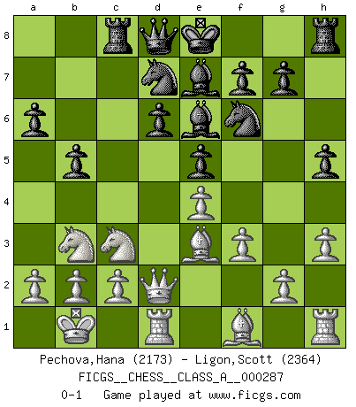 Last move : 0-1 2025 June 7 2:40:24 [Event "FICGS__CHESS__CLASS_A__000287"] [Site "FICGS"] [Date "2025.02.09"] [Round "1"] [White "Pechova,Hana"] [Black "Ligon,Scott"] [Result "0-1"] [WhiteElo "2173"] [BlackElo "2364"] 1.e4 c5 2.Nf3 d6 3.d4 cxd4 4.Nxd4 Nf6 5.Nc3 a6 6.Be3 e5 7.Nb3 Be6 8.f3 Be7 9.Qd2 h5 10.O-O-O Nbd7 11.Kb1 Rc8 12.h3 b5 0-1 This chess game has been lost on time (started : 2025.02.09 8:18:37) Follow this game move after move (download)I love all positions. Give me a difficult positional game, I will play it. But totally won positions, I cannot stand them. (Hein Donner) Sehr viele beherrschen heutzutage das große Einmalseins des Schachspiels und kennen sogar dessen Logarithmentafeln auswendig - deshalb sollte man hin und wieder zu beweisen trachten, dass zwei mal zwei auch fünf sein kann. (Mikhail Nekhemyevich Tal) El Ajedrez es un regaderazo frío para la mente. (Sir John Simon) D'abord les bases : Jouez et étudiez, puis étudiez et jouez, ensuite jouez et étudiez, puis étudiez et jouez. Deuxièmement : Donnez toujours le meilleur de vous-même ! (Ken Smith) Don't be irreplaceable, if you can't be replaced, you can't be promoted. (Dan Rotaru)