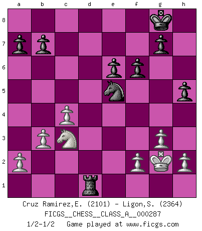Last move : 1/2-1/2 2025 April 3 3:35:12 [Event "FICGS__CHESS__CLASS_A__000287"] [Site "FICGS"] [Date "2025.02.09"] [Round "1"] [White "Cruz Ramirez,Eliecer"] [Black "Ligon,Scott"] [Result "1/2-1/2"] [WhiteElo "2101"] [BlackElo "2364"] 1.e4 c5 2.c3 Nf6 3.e5 Nd5 4.Nf3 d6 5.d4 cxd4 6.exd6 e6 7.Nxd4 Bxd6 8.g3 Nc6 9.Bg2 Nxd4 10.Qxd4 O-O 11.O-O Qc7 12.c4 Nf6 13.Nc3 Bd7 14.Rd1 Be5 15.Qe3 h5 16.Bd2 Rad8 17.Rac1 Bc6 18.Nb5 Qb8 19.Bc3 Bxc3 20.Nxc3 Ng4 21.Qe2 Bxg2 22.Kxg2 Qe5 23.Qxe5 Nxe5 24.b3 f6 25.Rxd8 Rxd8 26.Rd1 Rxd1 1/2-1/2 Follow this game move after move (download)A man without frontiers. He didn't divide the East and the West, he brought them together in their admiration for him. (Ljubomir Ljubojevic, about Bobby Fischer's death) In Buenos Aires ist es nicht mein vorrangiges Ziel ein starkes Turnier zu organisieren, sondern ein Turnier für Gentlemen. Ich würde nie Kamsky einladen. Ich mag keine Probleme. (Miguel Najdorf) Cada Peón es potencialmente una Reina. (James Mason) La tactique, c'est ce que vous faites quand il y a quelque chose à faire; la stratégie, c'est ce que vous faites quand il n'y a rien à faire. (Savielli Tartacower) Every now and then a man's mind is stretched by a new idea and never shrinks back to its former dimensions. (Oliver Wendell Holmes, Sr.)