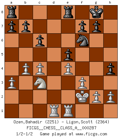 Last move : 1/2-1/2 2025 February 18 21:24:55 [Event "FICGS__CHESS__CLASS_A__000287"] [Site "FICGS"] [Date "2025.02.09"] [Round "1"] [White "Ozen,Bahadir"] [Black "Ligon,Scott"] [Result "1/2-1/2"] [WhiteElo "2251"] [BlackElo "2364"] 1.c4 e5 2.Nc3 Nf6 3.Nf3 Nc6 4.e4 Bb4 5.d3 d6 6.a3 Bc5 7.b4 Bb6 8.Be3 Bg4 9.Be2 Bxf3 10.Bxf3 Nd4 11.Na4 Nxf3+ 12.Qxf3 Bxe3 13.Qxe3 O-O 14.O-O c6 15.d4 exd4 16.Qxd4 Qe7 17.Rfe1 Rfe8 18.Rad1 h5 19.Nc3 Qe5 20.f3 h4 21.Qxe5 dxe5 22.Kf2 1/2-1/2 Follow this game move after move (download)You need not play well - just help your opponent to play badly. (Genrikh Chepukaitis) Ich verstehe den Grund nicht, warum die Aufteilung in Frauen und Männer überhaupt im Schach besteht. (Judith Polgar) El Ajedrez detiene a su maestro dentro de sus propios vínculos, encadenando la mente y el cerebro, por lo que la libertad interior del mas fuerte debe sufrir. (Albert Einstein) Donnez-moi un Cavalier en 6e et je gagnerais toutes mes parties. (Steinitz) There is no vagueness without wind. (Chinese proverb)