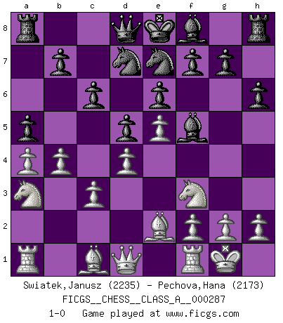 Last move : 1-0 2025 April 17 5:33:31 [Event "FICGS__CHESS__CLASS_A__000287"] [Site "FICGS"] [Date "2025.02.09"] [Round "1"] [White "Swiatek,Janusz"] [Black "Pechova,Hana"] [Result "1-0"] [WhiteElo "2235"] [BlackElo "2173"] 1.e4 c6 2.d4 d5 3.e5 Bf5 4.Nf3 e6 5.Be2 Nd7 6.O-O Ne7 7.c3 h6 8.a4 a6 9.b4 a5 10.Na3 1-0 Follow this game move after move (download)Your body has to be in top condition. Your Chess deteriorates as your body does. You can't separate body from mind. (Bobby Fischer) Mit Schach schule ich mein Gefühl für Geometrie, was für Tennis und Schach gleichermaßen wichtig ist. (Boris Becker) Cuando tu no sabes absolutamente que mas hacer, es tiempo de entrar en pánico. (John van der Wiel) Toutes choses étant égales, c'est la conviction qui gagne. Alliée à une volonté de vaincre, elle sert de détonateur, suscite des idées, disperse les doutes et aide à penser clairement. (Robert Fischer) Train yourself to let go of everything you fear to lose. (Master Yoda in Star Wars ep.3)