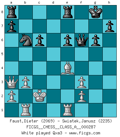 Last move : 0-1 2025 July 8 7:33:3 [Event "FICGS__CHESS__CLASS_A__000287"] [Site "FICGS"] [Date "2025.02.09"] [Round "1"] [White "Faust,Dieter"] [Black "Swiatek,Janusz"] [Result "0-1"] [WhiteElo "2069"] [BlackElo "2235"] 1.e4 e5 2.Nf3 Nc6 3.d4 exd4 4.Nxd4 Nf6 5.Nxc6 bxc6 6.e5 Qe7 7.Qe2 Nd5 8.c4 Ba6 9.Nd2 g6 10.Nf3 Nb6 11.b3 Bg7 12.Bb2 O-O 13.Qe3 Rfe8 14.O-O-O Bb7 15.Bd3 c5 16.Rhe1 d5 17.cxd5 Bxd5 18.Ba3 Bxf3 19.gxf3 Qh4 20.Qxc5 Qxh2 21.e6 fxe6 22.Kb1 Qf4 23.Be4 Qf6 24.Kc2 c6 25.Rb1 Bf8 26.Qa5 Bxa3 27.Qxa3 Nd5 28.Rbc1 Red8 29.Qa5 Rd6 30.Kb1 Rad8 31.Bxd5 Qf5+ 32.Ka1 cxd5 33.Qxa7 Qf6+ 34.Kb1 Qf5+ 35.Kb2 Qf6+ 36.Kb1 d4 37.Rc7 h5 38.Qa5 d3 39.Qd2 R8d7 40.Rc4 Qxf3 41.Re3 Qf5 42.R3e4 Kh7 43.Rf4 Qd5 44.Rfe4 e5 45.f4 exf4 46.Rxf4 Re6 47.Rf2 Qd6 48.Rc8 Qe7 49.Rf1 Re2 50.Qc3 Qe5 51.Rh1 d2 52.Rd1 Qxc3 53.Rxc3 g5 54.b4 g4 55.b5 Kh6 56.Kc2 h4 0-1 Follow this game move after move (download)He who takes the Queen's Knight's Pawn will sleep in the streets. (Anonymous) Schach ist ein Kampf gegen den Fehler. (Johannes Herrman Zukertort) La belleza de un movimiento no se refleja solo en su apariencia, sino en el pensamiento detrás de él. (Siegbert Tarrasch) Il (Jacob Murray) ne joue pas pour le bon coup, mais pour le meilleur. (Eloi Relange) If you don't practice you don't deserve to win. (Andre Agassi)