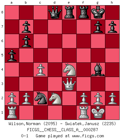Last move : 0-1 2025 March 23 16:21:31 [Event "FICGS__CHESS__CLASS_A__000287"] [Site "FICGS"] [Date "2025.02.09"] [Round "1"] [White "Wilson,Norman"] [Black "Swiatek,Janusz"] [Result "0-1"] [WhiteElo "2095"] [BlackElo "2235"] 1.e4 e5 2.Nf3 Nc6 3.Bc4 Nf6 4.d3 Bc5 5.Nbd2 O-O 6.Nb3 Bb6 7.Bd2 a5 8.Be3 d5 9.Bxd5 Nxd5 10.exd5 Qxd5 11.Bxb6 cxb6 12.O-O Bg4 13.Nbd2 f5 14.Qe1 Rae8 15.Qe3 e4 16.dxe4 fxe4 17.c4 Qd8 18.Ng5 Nd4 19.Ngxe4 Nc2 0-1 Follow this game move after move (download)No price is too great for the scalp of the enemy King. (Koblentz) Zu meiner Zeit war ein 20 jähriger ein junger Spieler, heute ist er ein Veteran. (Garry Kasparov) Aquel que ve no otra dirección en el juego que la de dar Jaque Mate a su oponente, nunca será un buen jugador de Ajedrez. (Euwe) La vérité est comme le meilleur coup aux échecs : elle existe, mais il faut la chercher. (Arturo Perez-Reverte) Nothing is more important for teaching us to understand the concepts we have than constructing fictitious ones. (Ludwig Wittgenstein)