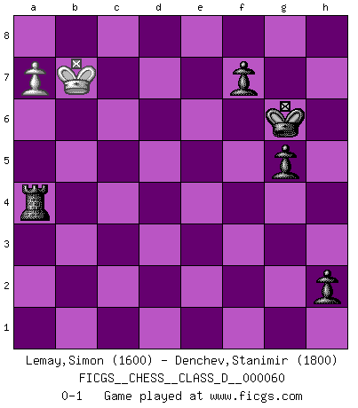 Last move : 0-1 2007 October 11 14:39:23 [Event "FICGS__CHESS__CLASS_D__000060"] [Site "FICGS"] [Date "2007.09.29"] [Round "1"] [White "Lemay,Simon"] [Black "Denchev,Stanimir"] [Result "0-1"] [WhiteElo "1600"] [BlackElo "1800"] 1.Nf3 d5 2.g3 g6 3.Bg2 Bg7 4.O-O Nd7 5.e3 Ngf6 6.d4 O-O 7.Nbd2 b6 8.b3 Bb7 9.Qe2 Re8 10.c4 e6 11.Bb2 c5 12.Rac1 Qe7 13.cxd5 exd5 14.dxc5 Nxc5 15.Ba3 Nfe4 16.Nxe4 Qxe4 17.Bxc5 bxc5 18.Rxc5 d4 19.Nh4 Qe7 20.Rfc1 dxe3 21.Bxb7 Qxb7 22.Rc7 exf2+ 23.Qxf2 Qd5 24.Nf3 a5 25.Qg2 a4 26.bxa4 Rxa4 27.Rc8 Rxc8 28.Rxc8+ Bf8 29.Rc2 Qd1+ 30.Ne1 Qxe1+ 31.Qf1 Qxf1+ 32.Kxf1 Kg7 33.Ke2 Ra3 34.Kd1 g5 35.Kc1 Kg6 36.Kb2 h5 37.Rc8 Be7 38.Re8 Re3 39.Ra8 Re2+ 40.Kb3 Rxh2 41.a4 Rg2 42.a5 Rxg3+ 43.Kc4 Rg4+ 44.Kb5 Bf6 45.a6 Bd4 46.Rb8 h4 47.Rb6+ Bxb6 48.Kxb6 Ra4 49.a7 h3 50.Kb7 h2 0-1 Reti : King's Indian attack Kingside Castling by player White (move 4) Kingside Castling by player Black (move 6) 10 pieces endgame at move 40 : White KRPP , Black KRBPPP WHITE : King + 1 Rook 2 Pawns BLACK : King + 1 Rook 1 Bishop 3 Pawns 9 pieces endgame at move 42 : White KRP , Black KRBPPP WHITE : King + 1 Rook 1 Pawn BLACK : King + 1 Rook 1 Bishop 3 Pawns 8 pieces endgame at move 47 : White KP , Black KRBPPP WHITE : King + 1 Pawn BLACK : King + 1 Rook 1 Bishop 3 Pawns 7 pieces endgame at move 48 : White KP , Black KRPPP WHITE : King + 1 Pawn BLACK : King + 1 Rook 3 Pawns Player Black won this chess game. Follow this game move after move (download)Chess opens and enriches your mind. (Saudin Robovic) Sicherlich können nur Meister einen Stil haben. Daß ein nicht-Meister auch nur ein einziges Mal in seinem Leben eine Partie folgerecht durchführte, habe ich niemals bemerkt. (Emanuel Lasker) El Rey es una pieza de pelea. ¡Usenlo!. (Wilhelm Steinitz) Je ne crois pas en la psychologie, je crois aux bons coups. (Robert Fischer) No, I am still playing. (Anatoly Karpov)