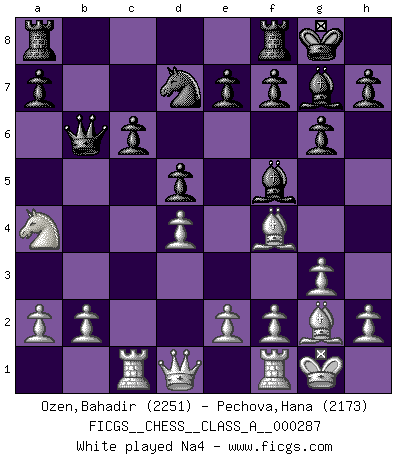 Last move : 1-0 2025 June 20 16:46:30 [Event "FICGS__CHESS__CLASS_A__000287"] [Site "FICGS"] [Date "2025.02.09"] [Round "1"] [White "Ozen,Bahadir"] [Black "Pechova,Hana"] [Result "1-0"] [WhiteElo "2251"] [BlackElo "2173"] 1.d4 Nf6 2.Nf3 g6 3.g3 Bg7 4.Bg2 O-O 5.O-O d5 6.c4 c6 7.cxd5 cxd5 8.Nc3 Nc6 9.Ne5 Bf5 10.Nxc6 bxc6 11.Bf4 Nd7 12.Rc1 Qb6 13.Na4 Qxd4 14.Qxd4 Bxd4 15.Rxc6 e6 16.Rd1 1-0 This chess game has been lost on time (started : 2025.02.09 8:18:37) Follow this game move after move (download)There just isn't enough televised Chess. (David Letterman) Wenn Du absolut nicht mehr weißt, was Du tun sollst, dann ist es Zeit für Panik. (John van der Wiel) Hoy en día, si tu no eres un Gran Maestro a los 14 años, es mejor que lo olvides. (Anand Viswanathan) Il n'y a pas eu de défaite parce que je ne crois pas que cet ordinateur ait jamais existé. IBM a triché en refusant d'imprimer les modes de recherche de la machine. C'est évident, pendant le match, des coups décisifs ont été joués par des êtres humains. Aujourd'hui, les meilleurs spécialistes en informatique ne peuvent toujours pas expliquer comment Deep-Blue a pu jouer contre la logique des ordinateurs. IBM a gagné une guerre de communication, mais ils sont incapables de prouver que l'ordinateur a gagné tout seul. (Garry Kasparov) Life is like internet, nothing interesting, but noone want to leave it. (Ilmars Cirulis)