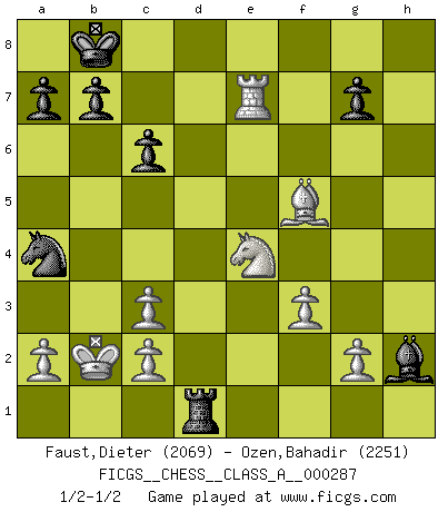 Last move : 1/2-1/2 2025 March 13 6:59:10 [Event "FICGS__CHESS__CLASS_A__000287"] [Site "FICGS"] [Date "2025.02.09"] [Round "1"] [White "Faust,Dieter"] [Black "Ozen,Bahadir"] [Result "1/2-1/2"] [WhiteElo "2069"] [BlackElo "2251"] 1.e4 c6 2.d4 d5 3.Nc3 dxe4 4.Nxe4 Bf5 5.Ng3 Bg6 6.N1e2 Nf6 7.Nf4 e5 8.Nxg6 hxg6 9.dxe5 Qa5+ 10.Bd2 Qxe5+ 11.Qe2 Bd6 12.O-O-O Nbd7 13.Bc3 Qxe2 14.Bxe2 Bf4+ 15.Kb1 O-O-O 16.Bc4 Ng4 17.Ne4 Rhe8 18.Rhe1 Bxh2 19.f3 f5 20.Bf7 Re7 21.Ng5 Ne3 22.Bxg6 Nxd1 23.Rxe7 Nxc3+ 24.bxc3 Nb6 25.Bxf5+ Kb8 26.Ne4 Rd1+ 27.Kb2 Na4+ 28.Ka3 Nb6 29.Kb2 Na4+ 1/2-1/2 Follow this game move after move (download)What is the difference between chess and football? Everybody understands football, but nobody plays it. Everybody plays chess, but nobody understands it. Everything is relative. (Vladimir Kramnik) Es gibt zwei Arten von Opfern: Korrekte und meine. (Mikhail Nekhemyevich Tal) El jugador táctico debe saber que hacer cuando algo se debe de hacer. El estratégico debe saber que hacer cuando nada se debe de hacer. (Savielly Tartakover) On est toujours la mazette de quelqu'un d'autre. (Anonyme) For a mechanic, you seem to do an excessive amount of thinking. (C-3PO in Star Wars ep.2)