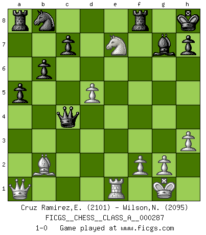 Last move : 1-0 2025 March 21 7:11:53 [Event "FICGS__CHESS__CLASS_A__000287"] [Site "FICGS"] [Date "2025.02.09"] [Round "1"] [White "Cruz Ramirez,Eliecer"] [Black "Wilson,Norman"] [Result "1-0"] [WhiteElo "2101"] [BlackElo "2095"] 1.e4 e5 2.Nf3 Nf6 3.Nxe5 d6 4.Nf3 Nxe4 5.d4 d5 6.Bd3 Be7 7.O-O O-O 8.c4 Nc6 9.cxd5 Qxd5 10.Nc3 Nxc3 11.bxc3 Bg4 12.Rb1 b6 13.Rb5 Qxa2 14.h3 Bd7 15.d5 Nb8 16.Rb2 Qa5 17.Qc2 f5 18.c4 Qa4 19.Qb1 Bc8 20.Re1 Bc5 21.Rbe2 a5 22.Bb2 Bd7 23.Nh4 Qb3 24.Bxf5 Bxf5 25.Nxf5 Qxc4 26.Re7 Bd4 27.Rxg7+ Bxg7 28.Ne7+ Kh8 29.Qa1 1-0 Follow this game move after move (download)The King is a fighting piece. Use it ! (Wilhelm Steinitz) Es hat in meinem Leben Zeiten gegeben, in denen das Schachspiel, wenn nicht zum Lebenszweck, so doch zu einem regelrechten Lebensersatz geworden ist. Man fühlt sich in solchen Zeiten nicht so, als besäße man eine göttliche Gabe, sondern eher so, als sei man von ihr besessen. (Garry Kasparov) Una victoria por una combinación errónea, aunque sea espectacular, me llena de horror artístico. (Wilhelm Steinitz) Les pièces de l'échiquier étaient impitoyables. Elles le retenaient, elles l'absorbaient. Il y avait de l'horreur en cela, mais aussi une harmonie unique. Car, qu'y a-t-il dans le monde, à part les échecs ? (V. Nabokov) Ah, beer! The cause of, and the solution to, all of life's problems. (Homer Simpson)