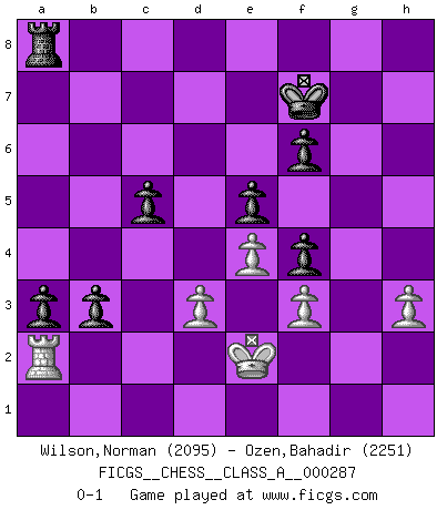 Last move : 0-1 2025 March 9 10:17:6 [Event "FICGS__CHESS__CLASS_A__000287"] [Site "FICGS"] [Date "2025.02.09"] [Round "1"] [White "Wilson,Norman"] [Black "Ozen,Bahadir"] [Result "0-1"] [WhiteElo "2095"] [BlackElo "2251"] 1.e4 e5 2.Nf3 Nc6 3.Bb5 Nf6 4.d3 Bc5 5.Bxc6 dxc6 6.O-O Nd7 7.Nbd2 O-O 8.Nc4 Re8 9.a4 a5 10.Be3 Bb4 11.Bg5 f6 12.Bd2 Nf8 13.Qe1 Bxd2 14.Qxd2 b6 15.Kh1 c5 16.Nh4 Ng6 17.Nxg6 hxg6 18.b3 Be6 19.Rfe1 Kf7 20.Re3 g5 21.Rg3 g6 22.h3 Rh8 23.Rf3 Bxc4 24.bxc4 g4 25.Rg3 gxh3 26.gxh3 Rh4 27.Re1 Qd7 28.Kg2 Rah8 29.R1e3 g5 30.Ref3 Rf4 31.Qc3 Qxa4 32.Rxf4 gxf4 33.Rg4 Qd7 34.Qa1 a4 35.Qa3 Qc6 36.f3 Ra8 37.Rh4 Qd6 38.Rh7+ Kg6 39.Rh4 Qd4 40.Rg4+ Kf7 41.Qa2 a3 42.c3 Qxc3 43.Kh1 Qb2 44.Rg2 Qxa2 45.Rxa2 c6 46.Kg1 b5 47.cxb5 cxb5 48.Kf2 b4 49.Ke2 b3 0-1 Follow this game move after move (download)It's just you and your opponent at the board and you're trying to prove something. (Bobby Fischer) Ich spiele ehrlich und spiele, um zu gewinnen. Wenn ich verliere nehme ich meine Medizin. (Robert James Fischer) El Ajedrez detiene a su maestro dentro de sus propios vínculos, encadenando la mente y el cerebro, por lo que la libertad interior del mas fuerte debe sufrir. (Albert Einstein) La solitude du joueur d'Echecs à l'approche du mat est semblable à celle du condamné. (Francis Szpiner) Happy endings are just stories that haven't finished yet. (Jane Smith in Mr & Mrs Smith)