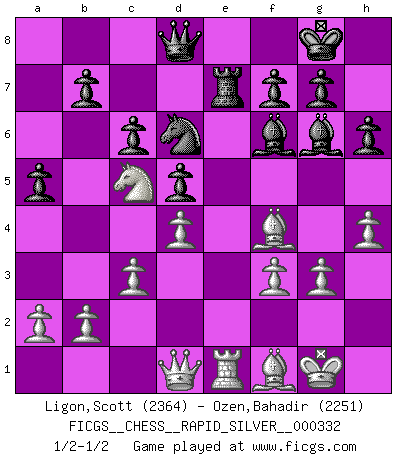 Last move : 1/2-1/2 2025 February 18 21:9:53 [Event "FICGS__CHESS__RAPID_SILVER__000332"] [Site "FICGS"] [Date "2025.02.09"] [Round "2"] [White "Ligon,Scott"] [Black "Ozen,Bahadir"] [Result "1/2-1/2"] [WhiteElo "2364"] [BlackElo "2251"] 1.e4 e5 2.Nf3 Nc6 3.Bb5 Nf6 4.O-O Nxe4 5.Re1 Nd6 6.Nxe5 Be7 7.Bf1 Nxe5 8.Rxe5 O-O 9.d4 Bf6 10.Re1 Re8 11.c3 Rxe1 12.Qxe1 Ne8 13.Bf4 d5 14.Nd2 Bf5 15.Qe2 c6 16.Re1 h6 17.Nb3 Nd6 18.Qf3 Bg6 19.g3 a5 20.Nc1 Ne4 21.Nd3 Qd7 22.Qd1 Re8 23.h4 Re7 24.f3 Nd6 25.Nc5 Qd8 1/2-1/2 Follow this game move after move (download)Fischer is the strongest player in the world. In fact, the strongest player who ever lived. (Larry Evans) Alles was am Schachbrett zählt sind gute Züge. (Robert James Fischer) Tu no necesitas jugar muy bien, únicamente ayudar a tu oponenet a que juegue muy mal. (Genrikh Chepukaitis) Les Echecs sont et restent toujours un combat, un combat intégral comme la boxe, la lutte ou un autre sport, et où il doit y avoir un vainqueur et un vaincu. (Joseph Emil Diemer) The best teachers teach from the heart, not from the book. (Author unknown)