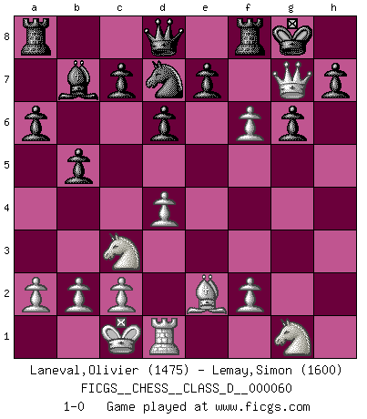 Last move : 1-0 2007 October 11 2:24:8 [Event "FICGS__CHESS__CLASS_D__000060"] [Site "FICGS"] [Date "2007.09.29"] [Round "1"] [White "Laneval,Olivier"] [Black "Lemay,Simon"] [Result "1-0"] [WhiteElo "1475"] [BlackElo "1600"] 1.d4 Nf6 2.g4 Nxg4 3.e4 d6 4.Be2 Nf6 5.Nc3 g6 6.Bg5 Nbd7 7.Qd2 Bg7 8.O-O-O O-O 9.h4 a6 10.h5 b5 11.hxg6 fxg6 12.Bh6 Bb7 13.Bxg7 Kxg7 14.Qh6+ Kg8 15.e5 Bxh1 16.exf6 Bb7 17.Qg7+ 1-0 Queen's pawn : Bronstein gambit Queenside Castling by player White (move 8) Kingside Castling by player Black (move 8) Player White won this chess game. Follow this game move after move (download)Chess makes man wiser and clear-sighted. (Vladimir Putin) Bobby Fischer ist kein Vorbild für die heutige Jugend. (Viktor Kortschnoi) El Ajedrez demanda una total concentración. (Bobby Fischer) Botvinnik disait en comparant les échecs à la musique: Il existe une science dont le but est l'étude de l'acoustique et des sons. Mais il y a aussi un art qui se sert de l'océan des sons : c'est la musique. De toute évidence, il en est de même pour la pensée. La logique est l'étude des lois de la réflexion et les échecs reflètent, en tant qu'art, le côté logique de la réflexion, sous la forme d'images artistiques... Extrait de Fischer - Spassky, Reykjavik 1972 par Alexander & F. Wyndham (Ed. Solar), p 37. Programmer - an organism that turns coffee into software. (Anonymous)