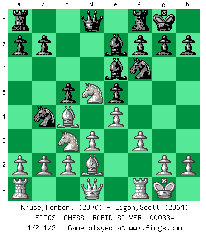 Last move : 1/2-1/2 2025 February 17 13:52:9 [Event "FICGS__CHESS__RAPID_SILVER__000334"] [Site "FICGS"] [Date "2025.02.11"] [Round "1"] [White "Kruse,Herbert"] [Black "Ligon,Scott"] [Result "1/2-1/2"] [WhiteElo "2370"] [BlackElo "2364"] 1.e4 c5 2.Nc3 Nc6 3.Nf3 e5 4.Bc4 Be7 5.d3 d6 6.Nd2 Nf6 7.Nf1 Bg4 8.f3 Be6 9.Ne3 O-O 10.O-O Nb4 11.Bd2 d5 12.Nexd5 1/2-1/2 Follow this game move after move (download)It is no time to be playing Chess when the house is on fire. (Italian Proverb) Karpov ist ein Museumsstück. (Garry Kasparov) Cuando tu casa esta en llamas, no puedes ser molestado por tus vecinos. O, como decinos en Ajedrez, si tu Rey esta bajo ataque, no te preocupa perder un Peón del lado de la Reina. (Gary Kasparov) Ce qui caractérise les parties de combat, c'est que si le défenseur a constamment de difficiles problèmes à résoudre, l'attaquant doit chercher sans relâche de nouvelles possibilités d'attaque. (Koblentz) The large trees attract high winds. (Chinese proverb)