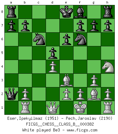 Last move : 1-0 2025 September 21 16:17:23 [Event "FICGS__CHESS__CLASS_B__000382"] [Site "FICGS"] [Date "2025.02.12"] [Round "1"] [White "Eser,Ipekyilmaz"] [Black "Pech,Jaroslav"] [Result "1-0"] [WhiteElo "1951"] [BlackElo "2190"] 1.d3 d5 2.d4 c5 3.c3 Nf6 4.g3 Nc6 5.Bg2 cxd4 6.cxd4 Bf5 7.Nf3 e6 8.Nh4 Bxb1 9.Rxb1 Qa5+ 10.Kf1 Qxa2 11.Be3 Bd6 12.h3 O-O 13.Kg1 h6 14.Kh2 Qc4 15.Rf1 a5 16.Nf3 Rfc8 17.Kg1 Nb4 18.Bd2 Ne4 19.Bxb4 Qxb4 20.e3 a4 21.Re1 b5 22.Re2 Rc7 23.Bf1 Rac8 24.Ra1 g6 25.Kg2 Qa5 26.Nd2 Bb4 27.Nb3 Qb6 28.Nc1 1-0 This chess game has been lost on time (started : 2025.02.12 8:45:36) Follow this game move after move (download)Pawn endings are to Chess what putting is to golf. (Cecil Purdy) Wenn es im Universum noch irgendwo intelligente Lebewesen gibt, dann kennen sie Go. (Emanuel Lasker) Jugadores de primera clase pierden en contra de jugadores de segunda clase porque los jugadores de segunda clase a veces juegan una partida de primer clase. (Siegbert Tarrasch) Il (Jacob Murray) ne joue pas pour le bon coup, mais pour le meilleur. (Eloi Relange) Two beer, or not two beer. (Unknown)