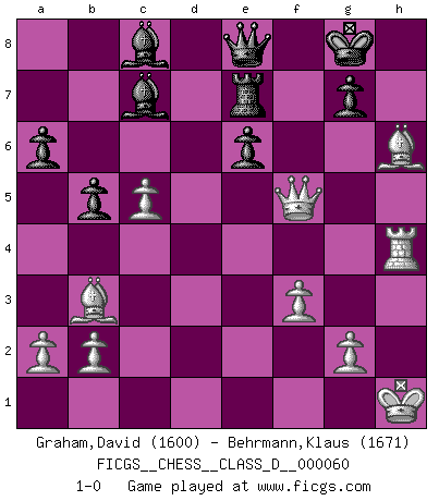 Last move : 1-0 2007 November 19 13:40:39 [Event "FICGS__CHESS__CLASS_D__000060"] [Site "FICGS"] [Date "2007.09.29"] [Round "1"] [White "Graham,David"] [Black "Behrmann,Klaus"] [Result "1-0"] [WhiteElo "1600"] [BlackElo "1671"] 1.e4 c6 2.c4 d5 3.exd5 cxd5 4.d4 Nf6 5.Nc3 e6 6.Nf3 dxc4 7.Bxc4 Bd6 8.O-O O-O 9.Qe2 Nbd7 10.Ne5 a6 11.Bb3 b5 12.Bg5 Bb7 13.Rac1 Rc8 14.Bc2 Qa5 15.Nxd7 Nxd7 16.Ne4 Qc7 17.Qd3 Bxh2+ 18.Kh1 f5 19.Bb3 Qb6 20.Rxc8 Rxc8 21.Nc5 Nxc5 22.dxc5 Qc6 23.f3 Bc7 24.Qxf5 Re8 25.Re1 Bc8 26.Bd2 Re7 27.Re4 Qe8 28.Rh4 h6 29.Bxh6 1-0 Caro-Kann : Anti-anti-Caro-Kann defense Kingside Castling by player White (move 8) Kingside Castling by player Black (move 8) Player White won this chess game. Follow this game move after move (download)Morphy was probably the greatest genius of them all. (Bobby Fischer) Im Reiche der Wirklichkeit ist man nie so glücklich wie im Reiche der Gedanken. (Arthur Schopenhauer) La enorme capacidad mental, en la que sin ella no puede un jugador de Ajedrez existir, es demasiado requerida por el Ajedrez al grado de que nunca podrá liberar su mente de este juego. (Albert Einstein) On croit qu'il y a plus de mauvais joueurs que de bons joueurs, c'est faux : Il y a autant de joueurs qui gagnent que de joueurs qui perdent. (Philippe Geluck) When you've done things right people won't know you've done anything at all. (Futurama)