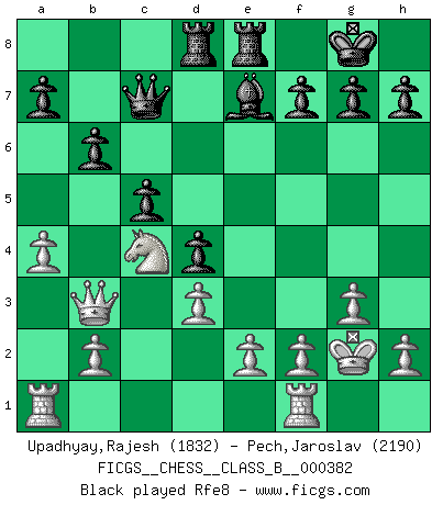 Last move : 0-1 2025 October 29 12:10:30 [Event "FICGS__CHESS__CLASS_B__000382"] [Site "FICGS"] [Date "2025.02.12"] [Round "1"] [White "Upadhyay,Rajesh"] [Black "Pech,Jaroslav"] [Result "0-1"] [WhiteElo "1832"] [BlackElo "2190"] 1.Nf3 c5 2.c4 Nf6 3.g3 d5 4.cxd5 Nxd5 5.Bg2 Nc6 6.O-O e5 7.d3 Be7 8.Nc3 Be6 9.Bd2 O-O 10.Nxd5 Bxd5 11.Bc3 Qc7 12.a4 b6 13.Nd2 Bxg2 14.Kxg2 Rad8 15.Qb3 Nd4 16.Bxd4 exd4 17.Nc4 Rfe8 18.Rfe1 Bg5 19.a5 Qc6+ 20.Kg1 b5 21.Na3 a6 22.f4 Bxf4 23.gxf4 Rd6 24.Rf1 Rg6+ 0-1 Follow this game move after move (download)A Chess game is divided into three stages: the first, when you hope you have the advantage, the second when you believe you have an advantage, and the third... when you know you're going to lose ! (Savielly Tartakower) Wenn du gegen Bobby spielst, ist es keine Frage von gewinnen oder verlieren. Es ist eine Frage des Überlebens. (Boris Vassilievich Spassky) Combinaciones deslumbrantes son para la mayoría, mover madera es para los pocos. (Georg Kieninger) La guerre est enfant de la passion, la passion est enfant du narcissisme et le narcissisme est l'enfant. (...) Une autre partie ? (Thibault de Vassal) Gambling : The sure way of getting nothing from something. (Wilson Mizner)
