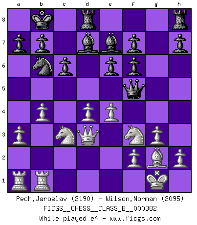 Last move : 0-1 2025 June 17 4:47:12 [Event "FICGS__CHESS__CLASS_B__000382"] [Site "FICGS"] [Date "2025.02.12"] [Round "1"] [White "Pech,Jaroslav"] [Black "Wilson,Norman"] [Result "0-1"] [WhiteElo "2190"] [BlackElo "2095"] 1.c4 e6 2.d4 Nf6 3.Nf3 d5 4.Nc3 Bb4 5.Bg5 c6 6.Qb3 Qa5 7.Bxf6 dxc4 8.Qxc4 gxf6 9.g3 Nd7 10.a3 Be7 11.Bg2 Nb6 12.Qd3 Bd7 13.O-O O-O-O 14.Rfb1 Kb8 15.b4 Qf5 16.e4 Qh5 17.a4 Nc8 18.e5 fxe5 19.Nxe5 Be8 0-1 This chess game has been lost on time (started : 2025.02.12 8:45:36) Follow this game move after move (download)Chess is a forcing house where the fruits of character can ripen more fully than in life. (Edward Morgan Foster) Ich könnte leicht behaupten: Ja,ja, Leonid Breschnew wollte nicht, daß ich Weltmeister werde. In der Tat war die Sache komplizierter. (Viktor Kortschnoi) Es muy difícil jugar en contra de la teoría de Einstein. - en su primera derrota en contra de Fischer (Mikhail Tal) Avant la finale, les dieux ont créé le milieu de partie. (Tarrasch) Logic : The art of thinking and reasoning in strict accordance with the limitations and incapacities of the human misunderstanding. (Ambrose Bierce)