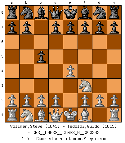 Last move : 1-0 2025 March 25 5:6:21 [Event "FICGS__CHESS__CLASS_B__000382"] [Site "FICGS"] [Date "2025.02.12"] [Round "1"] [White "Vollmer,Steve"] [Black "Tedoldi,Guido"] [Result "1-0"] [WhiteElo "1843"] [BlackElo "1815"] 1.e4 c5 2.Nf3 1-0 This chess game has been lost on time (started : 2025.02.12 8:45:36) Follow this game move after move (download)An attack on the wing should be met by play in the center. (Nimzovitch) Ivan Sokolov treibt mich als Beifahrer an mit go Loeky go - . (Loek van Wely) Las leyes del Ajedrez no permiten una libre elección: tienes que mover quieras o no. (Emanuel Lasker) Les Echecs sont et restent toujours un combat, un combat intégral comme la boxe, la lutte ou un autre sport, et où il doit y avoir un vainqueur et un vaincu. (Joseph Emil Diemer) To steal ideas from one person is plagiarism. To steal from many is research. (Unknown)