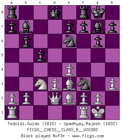 Last move : 0-1 2025 November 18 21:53:33 [Event "FICGS__CHESS__CLASS_B__000382"] [Site "FICGS"] [Date "2025.02.12"] [Round "1"] [White "Tedoldi,Guido"] [Black "Upadhyay,Rajesh"] [Result "0-1"] [WhiteElo "1815"] [BlackElo "1832"] 1.c4 c5 2.Nc3 Nc6 3.e3 Nf6 4.Nf3 d5 5.cxd5 Nxd5 6.e4 Nc7 7.h3 g6 8.d3 Bg7 9.Be3 Ne6 10.Be2 O-O 11.Qd2 b6 12.Nd5 Bb7 13.O-O Ncd4 14.Nc3 Nxf3+ 15.Bxf3 Nd4 16.Bxd4 Qxd4 17.Rac1 Rfd8 18.Rfd1 c4 19.Nb5 Qxb2 20.Qxb2 Bxb2 21.Rxc4 a6 22.Rb4 Be5 23.Na3 b5 24.Nc2 Rac8 25.Ne3 Bc3 26.Rb3 Bd4 27.a4 Rc3 28.Rxc3 Bxc3 29.axb5 axb5 30.Nd5 Bxd5 31.exd5 b4 32.Rb1 Rd6 33.Kf1 Ra6 34.g4 Ra2 35.Bd1 Rd2 36.Be2 g5 37.f3 Kg7 38.Kf2 Kf6 39.Ke3 Ke5 40.d4+ Rxd4 41.Rd1 b3 42.Rxd4 Bxd4+ 43.Kd2 Kxd5 44.Bd3 h6 45.Kc1 f6 46.Kb1 Ke5 47.Kc1 Kf4 0-1 Follow this game move after move (download)Modern Chess is too much concerned with things like Pawn structure. Forget it, Checkmate ends the game. (Nigel Short) Je älter ich werde, um so mehr schätze ich die Bauern. (Paul Keres) El poder defensivo de una pieza clavada, solamente es imaginario. (Aaron Nimzovich) Les sacrifices démontrent seulement que quelqu'un a gaffé. (Savielly Tartacover) War is the child of passion, passion is the child of narcissism and narcissism is the child. (...) Another game ? (Thibault de Vassal)