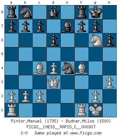 Last move : 1-0 2025 February 18 7:0:16 [Event "FICGS__CHESS__RAPID_C__000307"] [Site "FICGS"] [Date "2025.02.12"] [Round "1"] [White "Pintor,Manuel"] [Black "Budnar,Milos"] [Result "1-0"] [WhiteElo "1735"] [BlackElo "1500"] 1.e4 e5 2.f4 exf4 3.Nf3 d6 4.d4 Bg4 5.Bc4 Nf6 6.Nc3 Be7 7.O-O O-O 8.Bxf4 h6 9.h3 Bh5 10.Qd3 Bg6 11.Nh4 Bxe4 12.Nxe4 Nxe4 13.Ng6 1-0 Follow this game move after move (download)By playing at Chess then, we may learn: First: Foresight... Second: Circumspection... Third: Caution... And lastly, we learn by Chess the habit of not being discouraged by present bad appearances in the state of our affairs, the habit of hoping for a favorable chance, and that of persevering in the secrets of resources. (Benjamin Franklin) Schach ist die gewalttätigste aller Sportarten. (Garry Kasparov) EL Ajedrez es como la vida. (Boris Spassky) Karpov est une pièce de musée. (Garry Kasparov) Remember : Your focus determines your reality. (Qui-Gon Jinn in Star Wars ep.1)