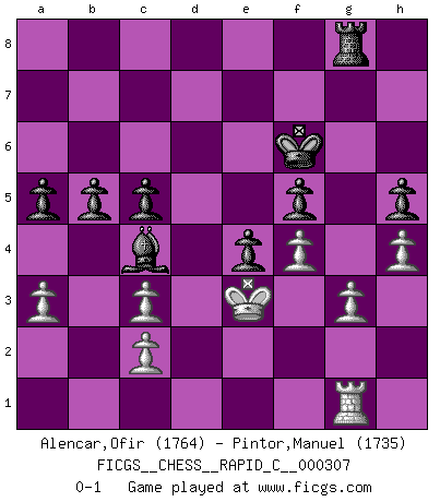 Last move : 0-1 2025 April 18 14:34:13 [Event "FICGS__CHESS__RAPID_C__000307"] [Site "FICGS"] [Date "2025.02.12"] [Round "1"] [White "Alencar,Ofir"] [Black "Pintor,Manuel"] [Result "0-1"] [WhiteElo "1764"] [BlackElo "1735"] 1.d4 d5 2.Nf3 Nc6 3.Nc3 Nf6 4.Ne5 e6 5.e3 Bb4 6.Bd2 Bxc3 7.Bxc3 Nxe5 8.dxe5 Ne4 9.f3 Nxc3 10.bxc3 O-O 11.e4 Qh4+ 12.g3 Qh5 13.f4 Qxd1+ 14.Kxd1 dxe4 15.Be2 f5 16.exf6 gxf6 17.Bc4 f5 18.Re1 Rd8+ 19.Ke2 a6 20.Rad1 Bd7 21.Ke3 Kf7 22.Rd4 b5 23.Bb3 c5 24.Bxe6+ Bxe6 25.Rxd8 Rxd8 26.a3 h5 27.h4 Kf6 28.Ke2 Bc4+ 29.Ke3 a5 30.Rg1 Rg8 0-1 Follow this game move after move (download)Chess is a matter of delicate judgment, knowing when to punch and how to duck. (Bobby Fischer) Dieses schreckliche Gefühl, dass ich gegen eine Maschine spielte, die niemals Fehler macht, zerschmetterte meinen Widerstand. (Mark Taimanov) No solamente yo pronostico su triunfo sobre Botvinnik, sino que me adelanto y digo que probablemente Fischer es el jugador de Ajedrez mas grande que haya existido. (John Collins) Le jeu d'échecs fait naître et fortifie en nous plusieurs qualités précieuses dans le cours de l'existence, telles que la prévoyance, la circonspection, la prudence, et la persévérance. (Benjamin Franklin - 1783, la morale des échecs) I can't decide which is riskier; taking crazy risks, or taking advice on crazy risks from a crazy risk taker. (Gregory House in House M.D.)