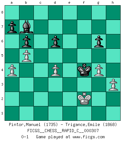 Last move : 0-1 2025 March 21 17:46:53 [Event "FICGS__CHESS__RAPID_C__000307"] [Site "FICGS"] [Date "2025.02.12"] [Round "1"] [White "Pintor,Manuel"] [Black "Trigance,Emile"] [Result "0-1"] [WhiteElo "1735"] [BlackElo "1868"] 1.e4 e5 2.f4 exf4 3.Nf3 g5 4.Bc4 g4 5.O-O gxf3 6.Qxf3 Qf6 7.c3 Nc6 8.d4 Nxd4 9.Bxf7+ Qxf7 10.cxd4 Bh6 11.e5 Ne7 12.Bxf4 Bxf4 13.Qxf4 Qxf4 14.Rxf4 Ng6 15.Rf6 Rf8 16.Rxf8+ Kxf8 17.Nc3 d6 18.Rf1+ Kg7 19.exd6 cxd6 20.Nd5 b6 21.Re1 Bd7 22.b3 Rc8 23.Ne7 Rf8 24.Nxg6 hxg6 25.Re7+ Rf7 26.Re2 Bb5 27.Re1 Rf4 28.Rd1 Re4 29.a4 Ba6 30.b4 Kf7 31.b5 Bb7 32.Kf2 Kf6 33.h3 Ke6 34.Rd3 Kf5 35.Rf3+ Rf4 36.g4+ Kg5 37.Rxf4 Kxf4 0-1 Follow this game move after move (download)All Chess players should have a hobby. (Savielly Tartakower) Schach ist Leben. (Robert James Fischer) El arma más poderosa en el Ajedrez, es tener la próxima movida. (David Bronstein) Plusieurs personnes se sont demandées comment Tal faisait pour gagner... En fait, c'est très simple ! Il met ses pièces au centre de l'échiquier et les sacrifie quelque part ! (David Bronstein) If computers get too powerful, we can organize them into committees. That'll do them in. (Anonymous)