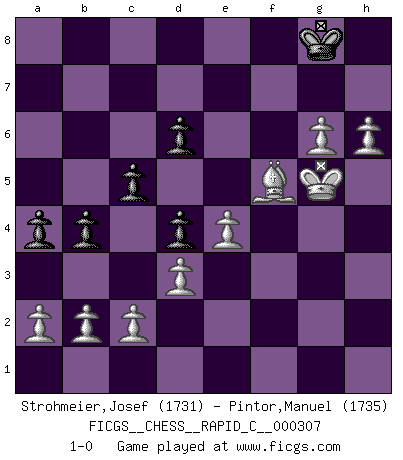 Last move : 1-0 2025 May 9 3:13:27 [Event "FICGS__CHESS__RAPID_C__000307"] [Site "FICGS"] [Date "2025.02.12"] [Round "1"] [White "Strohmeier,Josef"] [Black "Pintor,Manuel"] [Result "1-0"] [WhiteElo "1731"] [BlackElo "1735"] 1.e4 e5 2.Nf3 Nc6 3.Bb5 Bc5 4.O-O Qf6 5.Nc3 Nge7 6.d3 h6 7.Be3 Nd4 8.Bxd4 Bxd4 9.Nxd4 exd4 10.Ne2 c6 11.Bc4 O-O 12.f4 b5 13.Bb3 c5 14.f5 Bb7 15.Nf4 Qg5 16.Nh5 Kh8 17.f6 gxf6 18.Nxf6 d6 19.Qf3 Ng6 20.Nd7 Rg8 21.Bxf7 Nh4 22.Qf6+ Qxf6 23.Rxf6 Rg7 24.Rxh6+ Rh7 25.Rxh7+ Kxh7 26.Rf1 Bc6 27.Be6 Bxd7 28.Bxd7 Rg8 29.Rf2 b4 30.g3 Kh6 31.Kh1 Rg7 32.Rf6+ Rg6 33.Rf4 Nf3 34.Rxf3 Rg5 35.Rf6+ Rg6 36.Rxg6+ Kxg6 37.Kg2 a5 38.h4 Kh5 39.Kh3 Kh6 40.g4 Kg6 41.Kg3 Kf6 42.Kf4 Kg6 43.h5+ Kf6 44.g5+ Ke7 45.Bf5 a4 46.h6 Kf7 47.g6+ Kg8 48.Kg5 1-0 Follow this game move after move (download)Chess is ruthless: you've got to be prepared to kill people. (Nigel Short) Wer der Ansicht ist, daß alle Schachspieler verrückt sind, wird durch Studium des Lebens von Emil Josef Diemer nicht auf andere Gedanken kommen. (Hans Ree) El Ajedrez tiene tanto misterio como las mujeres. (Purdy) Echiquier : carré parfait, comme la Jérusalem nouvelle décrite par l'auteur de l'Apocalypse, huit cases sur huit, exaltation du chiffre 4, symbole du cosmos aux quatre horizons... où le noir et le blanc, l'ombre et la lumière, le mal et le bien s'entremêlent et se conjuguent. (Robert Couffignal, Le Gambit du poète) My poor ole parrot... Is not in the circulation of displays ....poo hoo hoo :) (Wayne Lowrance's enigma)