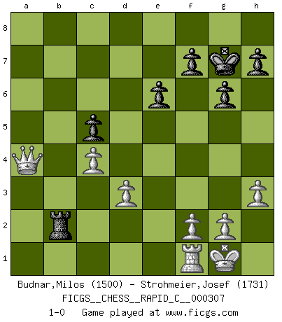 Last move : 1-0 2025 March 27 17:36:43 [Event "FICGS__CHESS__RAPID_C__000307"] [Site "FICGS"] [Date "2025.02.12"] [Round "1"] [White "Budnar,Milos"] [Black "Strohmeier,Josef"] [Result "1-0"] [WhiteElo "1500"] [BlackElo "1731"] 1.e4 c5 2.Bc4 Nc6 3.Nf3 e6 4.O-O a6 5.d3 b5 6.Bb3 a5 7.a3 d6 8.Be3 Qc7 9.Nc3 Be7 10.Nxb5 Qb6 11.Ba4 Bd7 12.c4 Nf6 13.h3 O-O 14.Bg5 Rfd8 15.Bxf6 Bxf6 16.Rb1 Be8 17.b3 Na7 18.Nxa7 Qxa7 19.Bxe8 Rxe8 20.a4 Rab8 21.Re1 Rb4 22.e5 dxe5 23.Nxe5 Reb8 24.Nc6 Rxb3 25.Nxa7 Rxb1 26.Qd2 R1b2 27.Qxa5 Bd4 28.Rf1 Ra8 29.Qc7 g6 30.Nc6 Bf6 31.Ne7 Bxe7 32.Qxe7 Rxa4 33.Qe8 Kg7 34.Qxa4 1-0 Follow this game move after move (download)Before the endgame, the Gods have placed the middle game. (Siegbert Tarrasch) Um dein Spiel zu verbessern musst du zuallererst das Endspiel studieren, denn diese kann unabhängig studiert werden. Die Eröffnung und das Mittelspiel müssen immer in Bezug gesetzt werden zum Endspiel. (José Raúl Capablanca) El Ajedrez lo es todo: arte, ciencia y deporte. (Anatoly Karpov) Dieu déplace le joueur, et celui-ci la pièce. Quel Dieu derrière Dieu commence donc la trame ? Arturo Perez-Reverte (prix de littérature policière 1993). To be champion requires more than simply being a strong player; one has to be a strong human being as well. (Anatoly Karpov)
