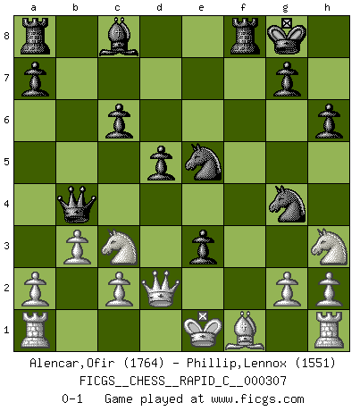 Last move : 0-1 2025 February 21 17:25:35 [Event "FICGS__CHESS__RAPID_C__000307"] [Site "FICGS"] [Date "2025.02.12"] [Round "1"] [White "Alencar,Ofir"] [Black "Phillip,Lennox"] [Result "0-1"] [WhiteElo "1764"] [BlackElo "1551"] 1.d4 f5 2.d5 Nf6 3.Nc3 c6 4.dxc6 bxc6 5.Nf3 d6 6.e4 fxe4 7.Ng5 d5 8.f3 h6 9.Nh3 e5 10.f4 Bd6 11.fxe5 Bxe5 12.Bf4 Nbd7 13.Bxe5 Nxe5 14.Nf4 Qb6 15.b3 Nfg4 16.Qe2 O-O 17.Nh3 Qb4 18.Qd2 e3 0-1 Follow this game move after move (download)The tactician knows what to do when there is something to do; whereas the strategian knows what to do when there is nothing to do. (Gerald Abrahams) Wie gewinnt Tal? Er entwickelt alle seine Figuren in die Brettmitte und opfert sie dann irgendwo. (Robert James Fischer) No es suficiente ser un buen jugador, se debe también de jugar bién. (Siegbert Tarrasch) Celui qui prend des risques peut perdre, celui qui n'en prend pas perd toujours. (Xavier Tartacover) Whenever people agree with me, I always feel I must be wrong. (Oscar Wilde)